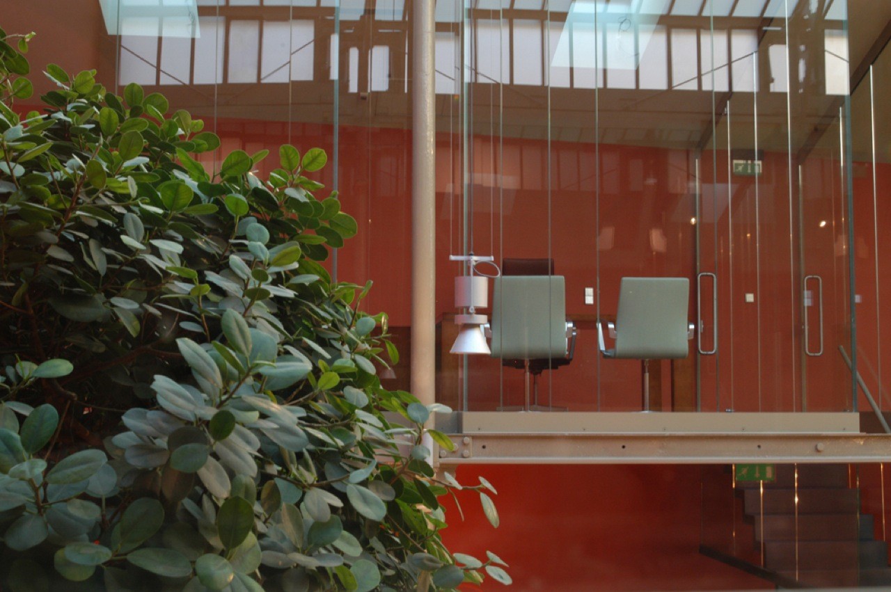 In addition there is one (divisible) meeting-room, a common recreational room, a kitchen, rest rooms, and, at the special request of the patron, lush vegetation all over the main space.