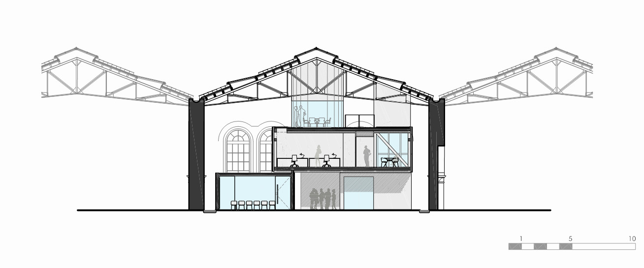 The approach taken for the project is to add a new contemporary architecture to the interior of the existing structure, generating a connection between the two. The original building, a 16th century industrial hangar, is structurally stable on the outside. The new project will be contained within that structure, without any visibility from the outside.