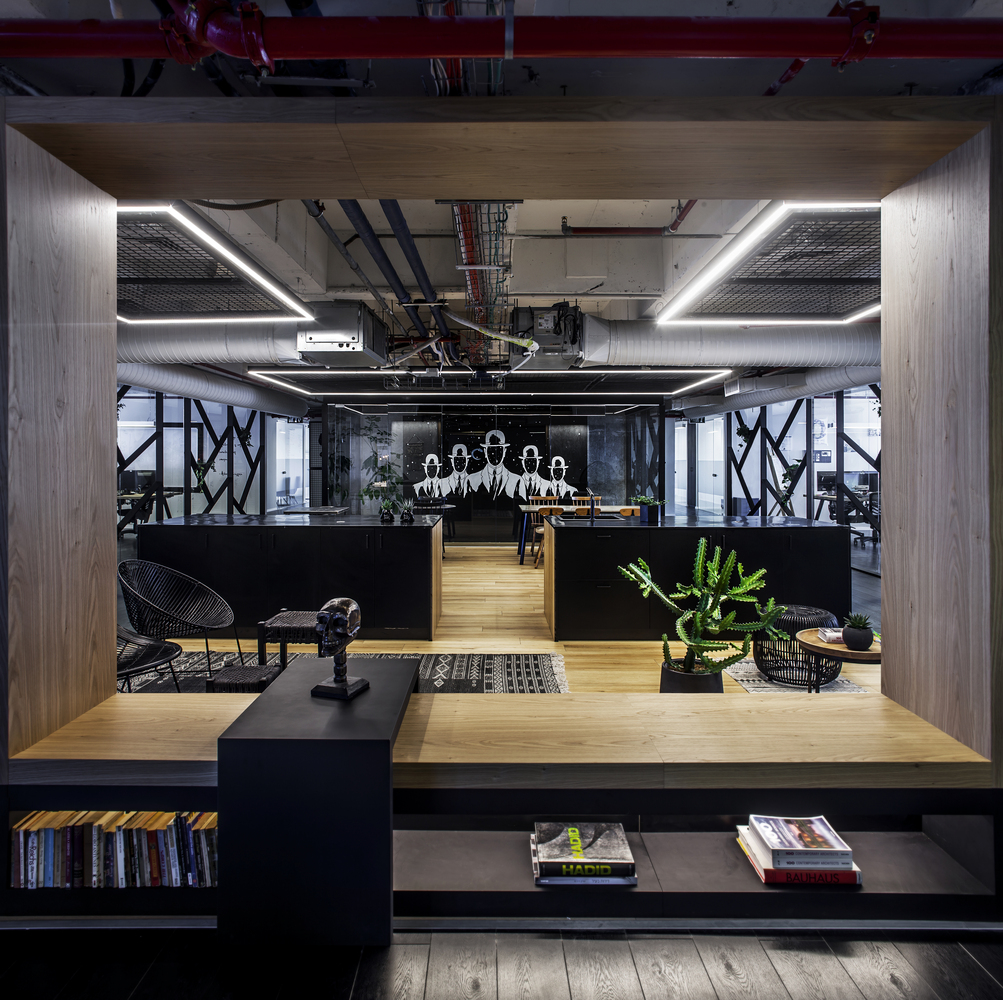 Three open-space work areas, seven private offices and three meeting rooms fall off of the huge central recreational area. Due to the secrecy of the company's operations, the theme is anonymity.