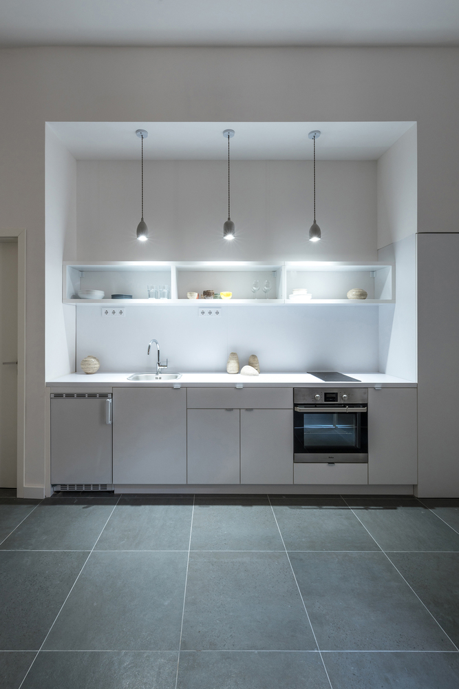 In the end the result was an “L” shaped plan where the entrance positioned in the flat’s center of gravity made it possible to create a large entrance hall for easy access to all three studios.