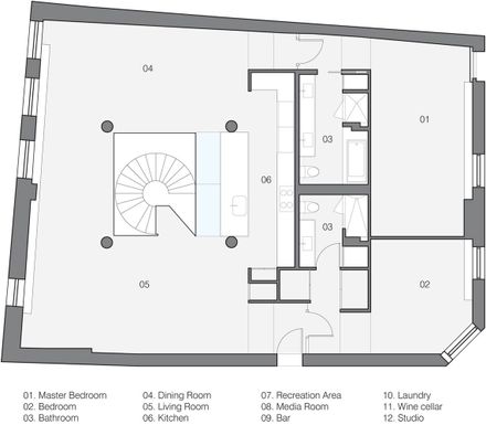 A sculptural spiral staircase occupies this negative space, which brings light to the recreational spaces at the cellar level. A counterpoint to the void is provided by an adjacent solid, which houses the kitchen and bathroom spaces and separates the private bedrooms from the public areas of the apartment.