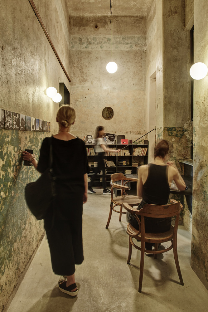 A ground floor is a place for lectures and exhibitions. In an effort to add functionality, we used height and created a "second floor" for employees. The floor and walls are also restored as much as possible.