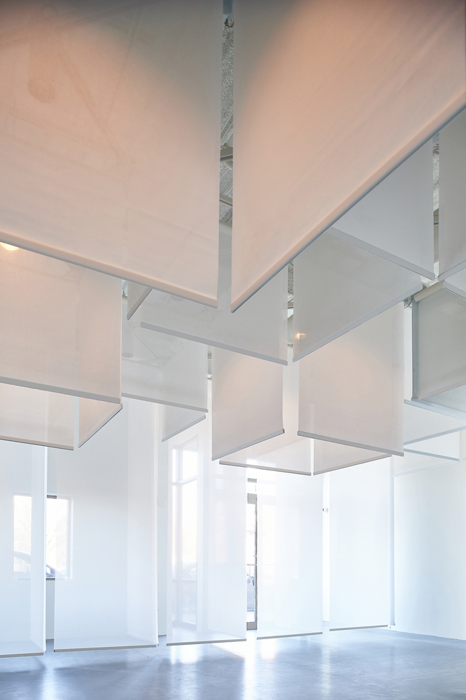In response, the design borrows from the language of set design — inserting a system of translucent partitions that descend from above to change ceiling height, modulate light, define light boxes, or repartition space.