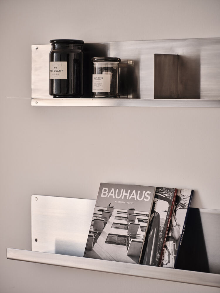 In contrast to these subdued materials, stainless steel was used for the open display shelving unit to softly complement the floors and objects on display.