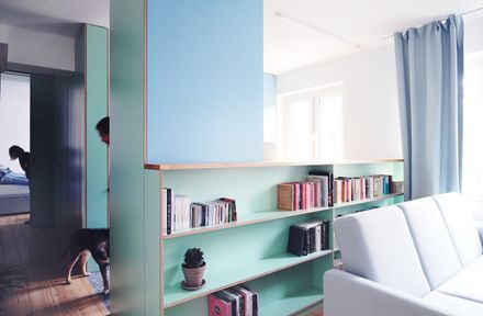 The character of the enlarged space is defined by the multifunctional „wall-furniture” dividing the surfaces into particular functions: a living room, a kitchen, the bedroom, the bathroom, and an entry area.