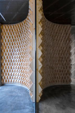 The curved wood wall, seen from entrance hall, represents an central accent of the office, completed with rhomboid pattern.