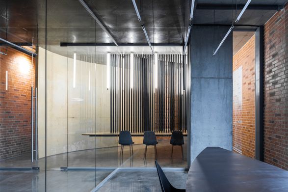 The glass walls are used to divide the functional parts of the office, also they maximize the sunlight access into all working spaces.