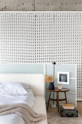 The Raw White Color by the brand Coral is predominant, becoming the main character of the palette, and a few elements in black create focal points.The bay window, parallel to the bed, frames the view and also becomes part of the furniture.