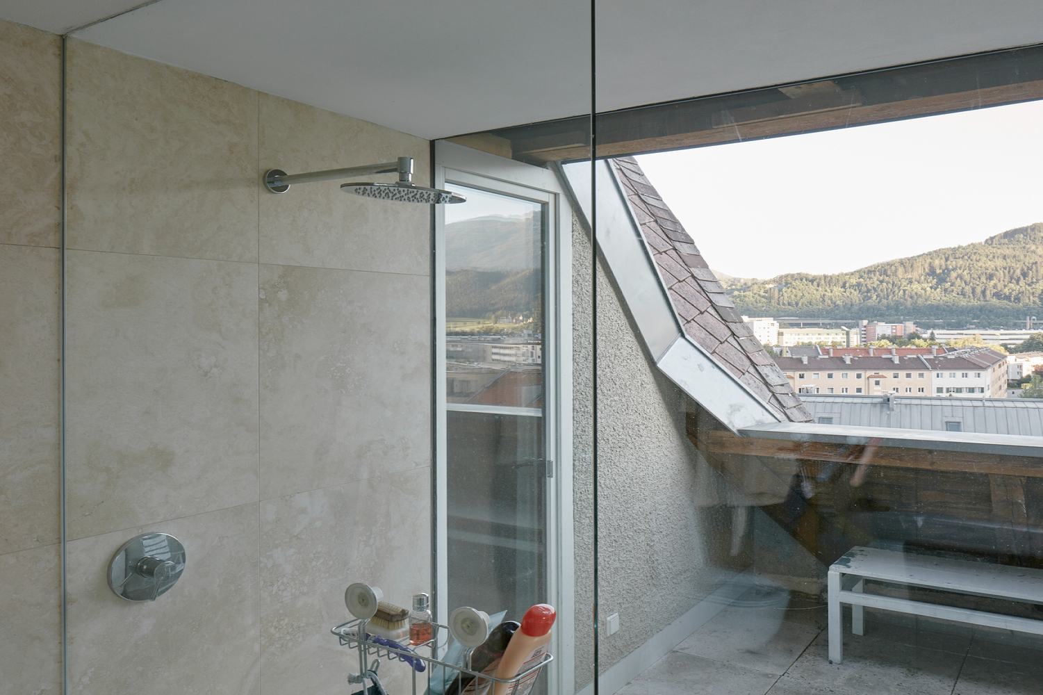 The roof is suspended off the balustrade of the garden enabling a free view to the mountains and the landscape of the city below.