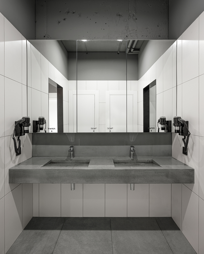 Reception area and a café set up the tone and the mood of the venue. The main color of the entire place is light grey; the main materials are cold – concrete, glass, and metal. An interior that could be called ‘ascetic’ suggests none of unnecessary distractions, and helps to say focused.
