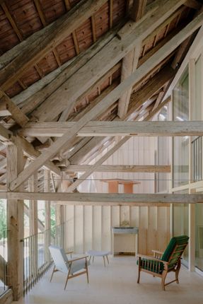 Inside an old 17th-century barn in which no line is straight, a wooden box with fully glazed facades takes place to accommodate a new apartment.
