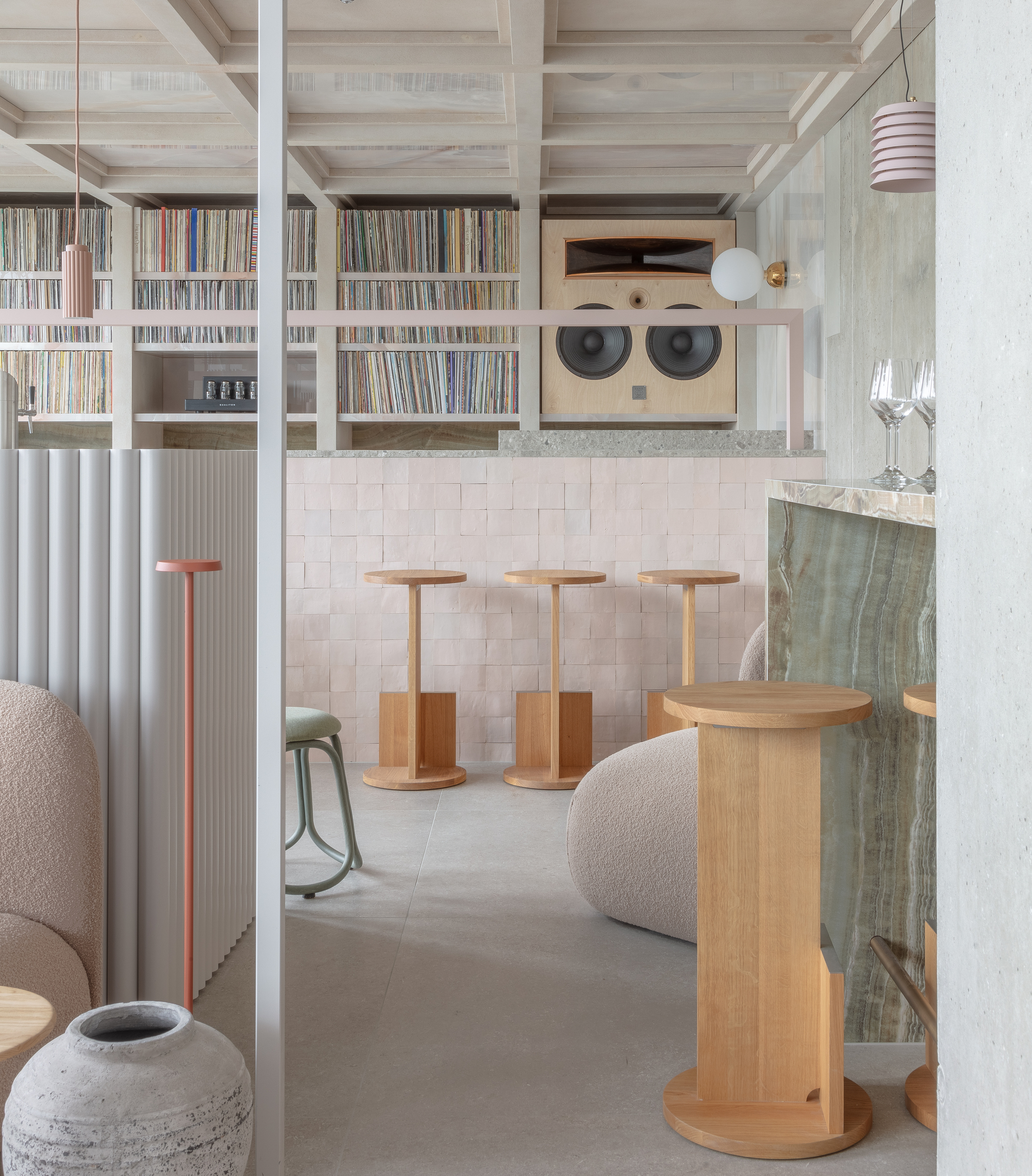 Timber, tumbled stone, onyx, zellige tile, and plaster clad the joinery while slatted and coffered canopies shelter various compositions throughout the space.