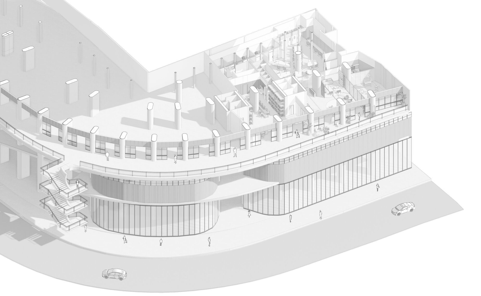 Both are located near the façade to strengthen ties and expand the organization's exchanges with society.