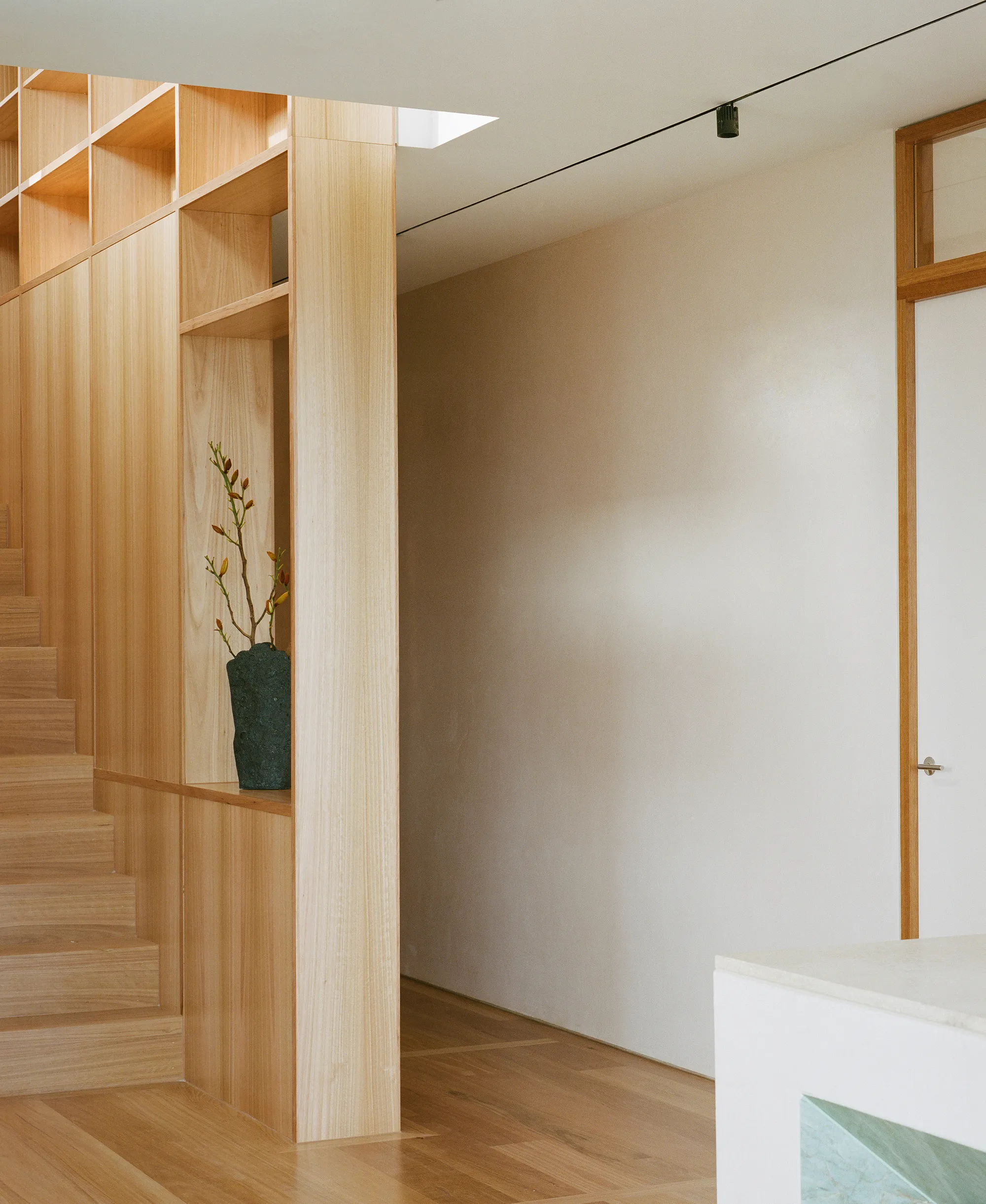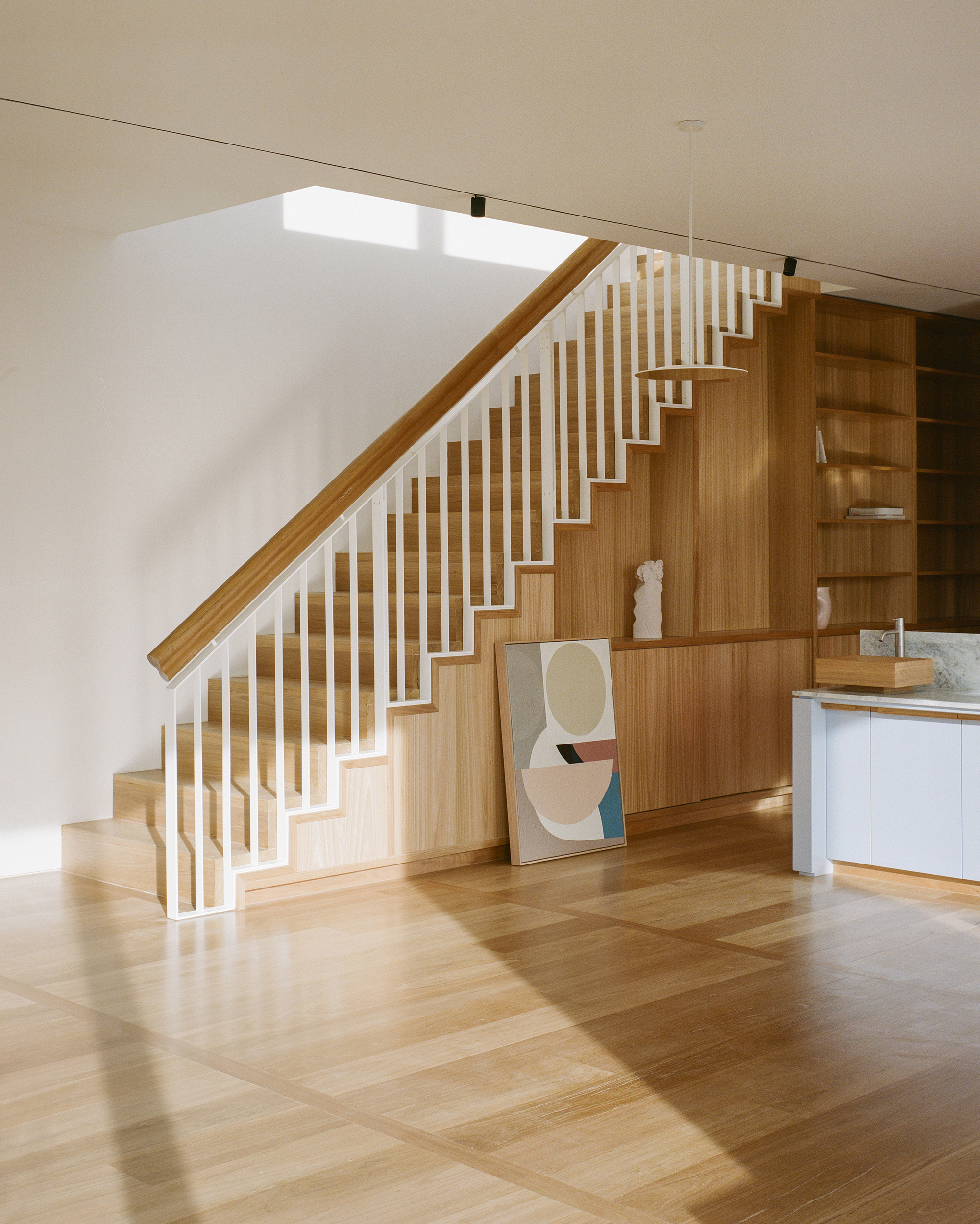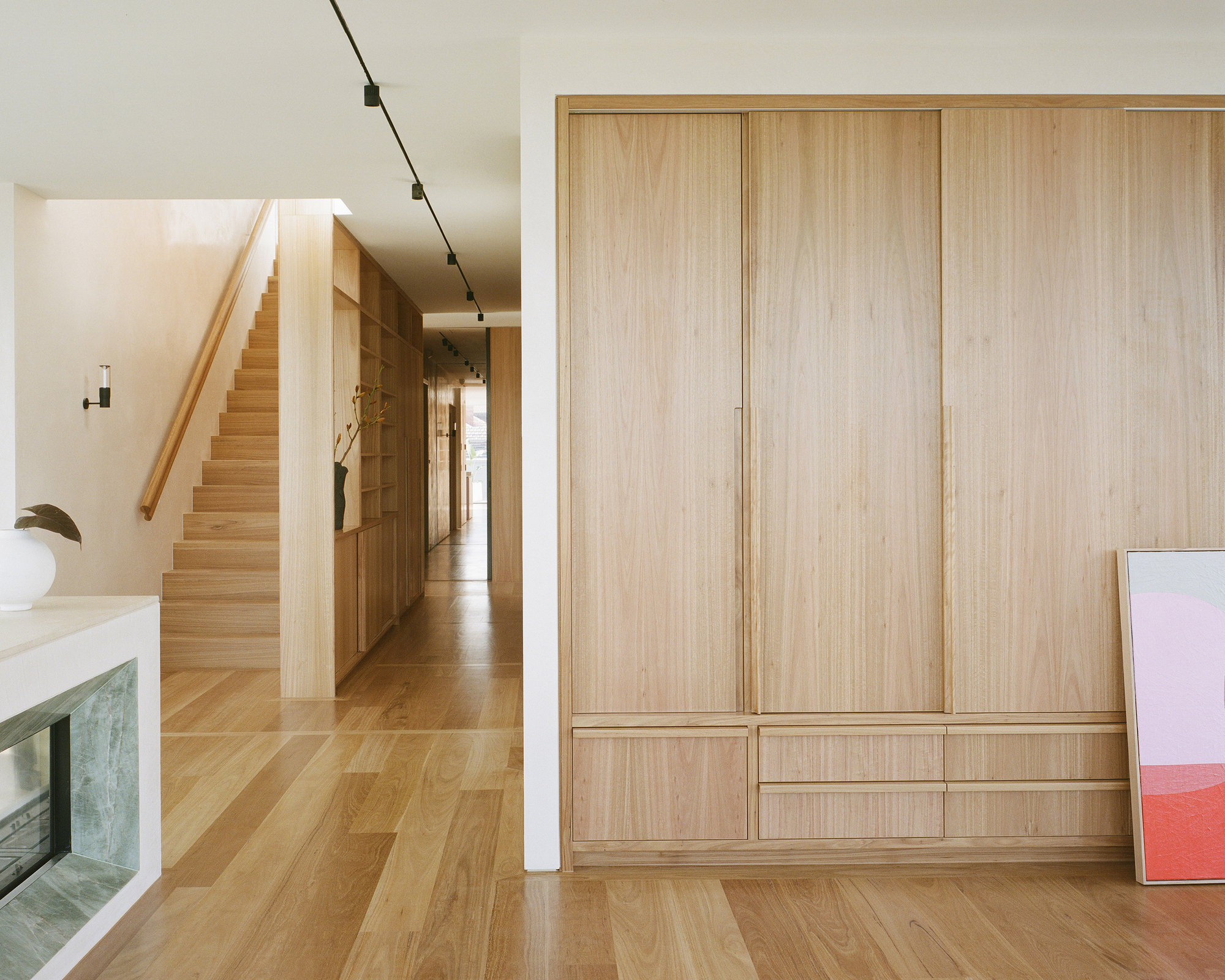 The library spine is also used to celebrate the entrance lobby and define both the horizontal circulation and the vertical circulation as the joinery is embedded into the staircase.