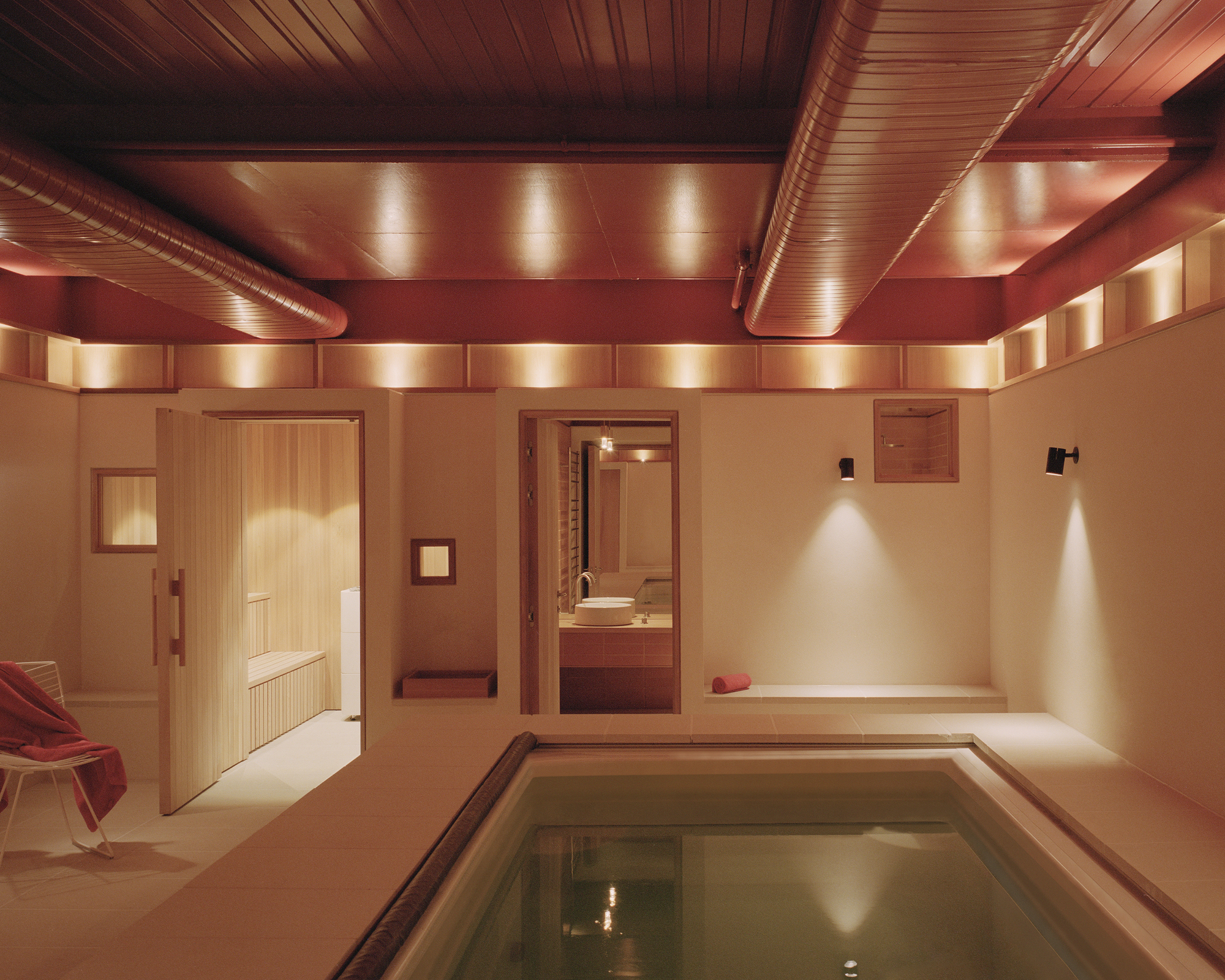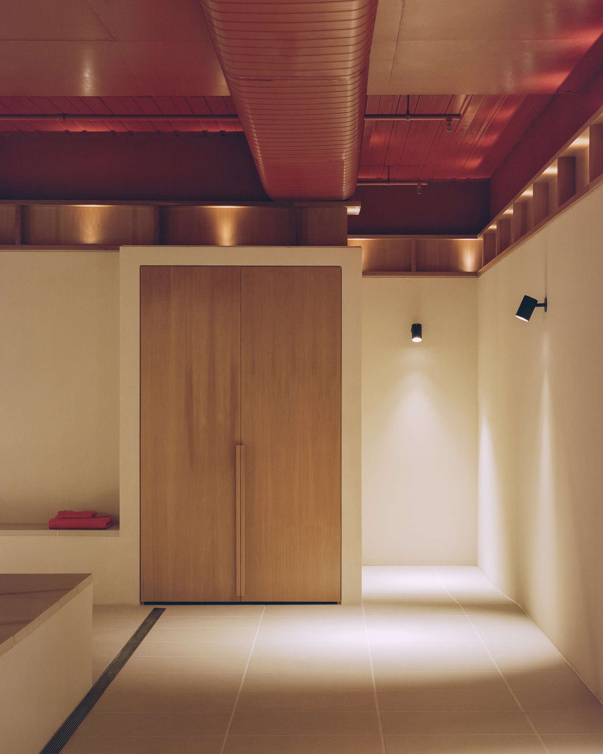 Although a subterranean space with no natural light, the careful use of atmospheric indirect lighting, warm colors, and natural materials provides a holistic restorative experience in likening to a Finnish sauna or Japanese Onsen.