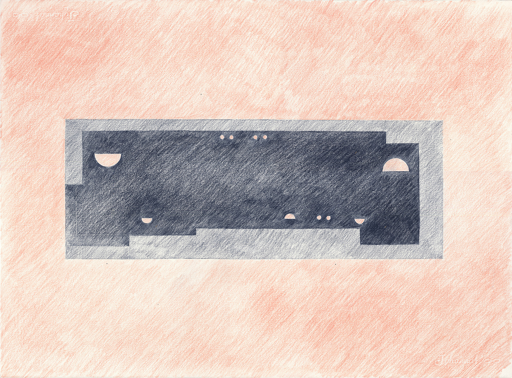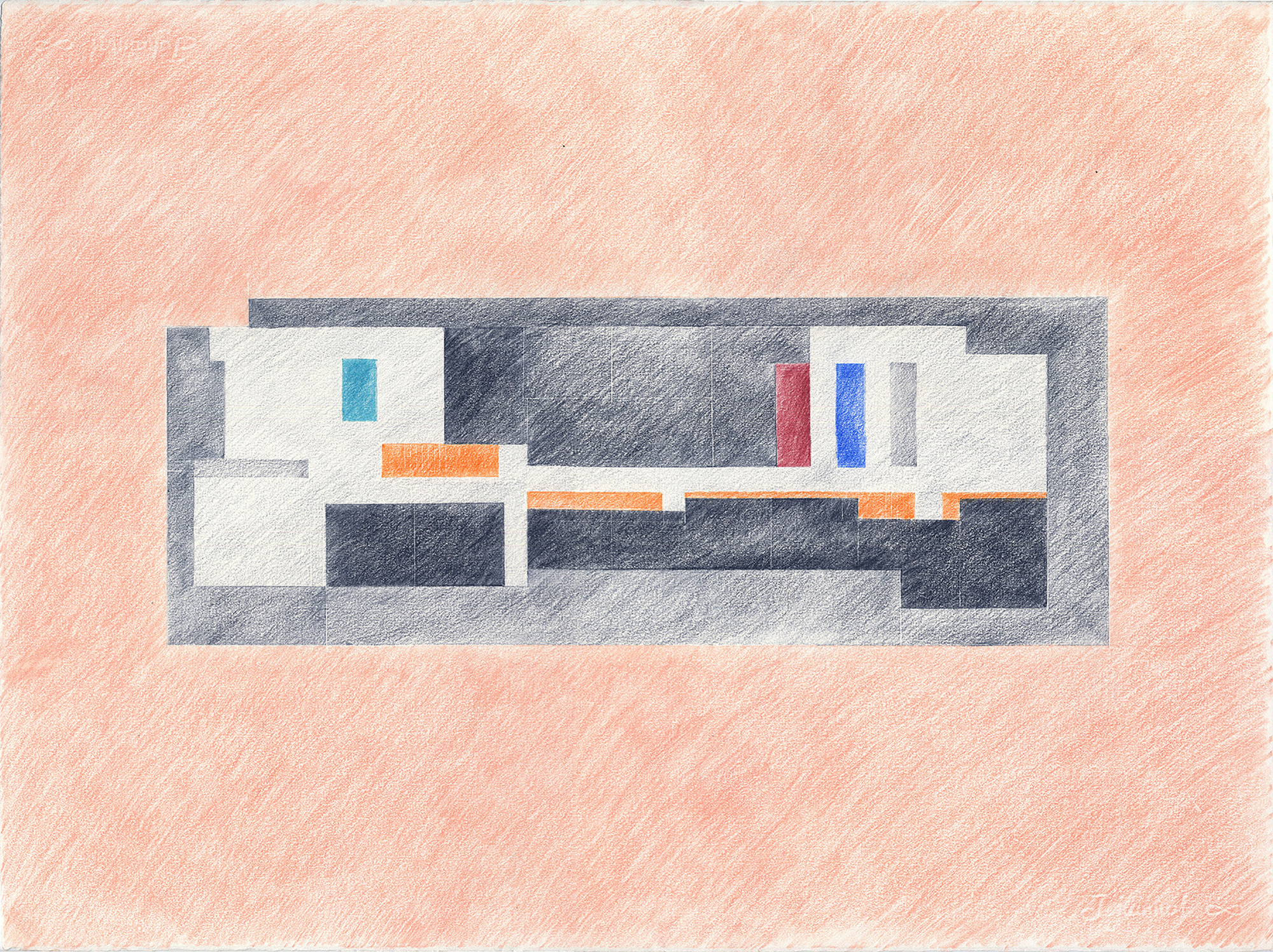 This pure geometry furthers the abstract composition given by the colored volumes.