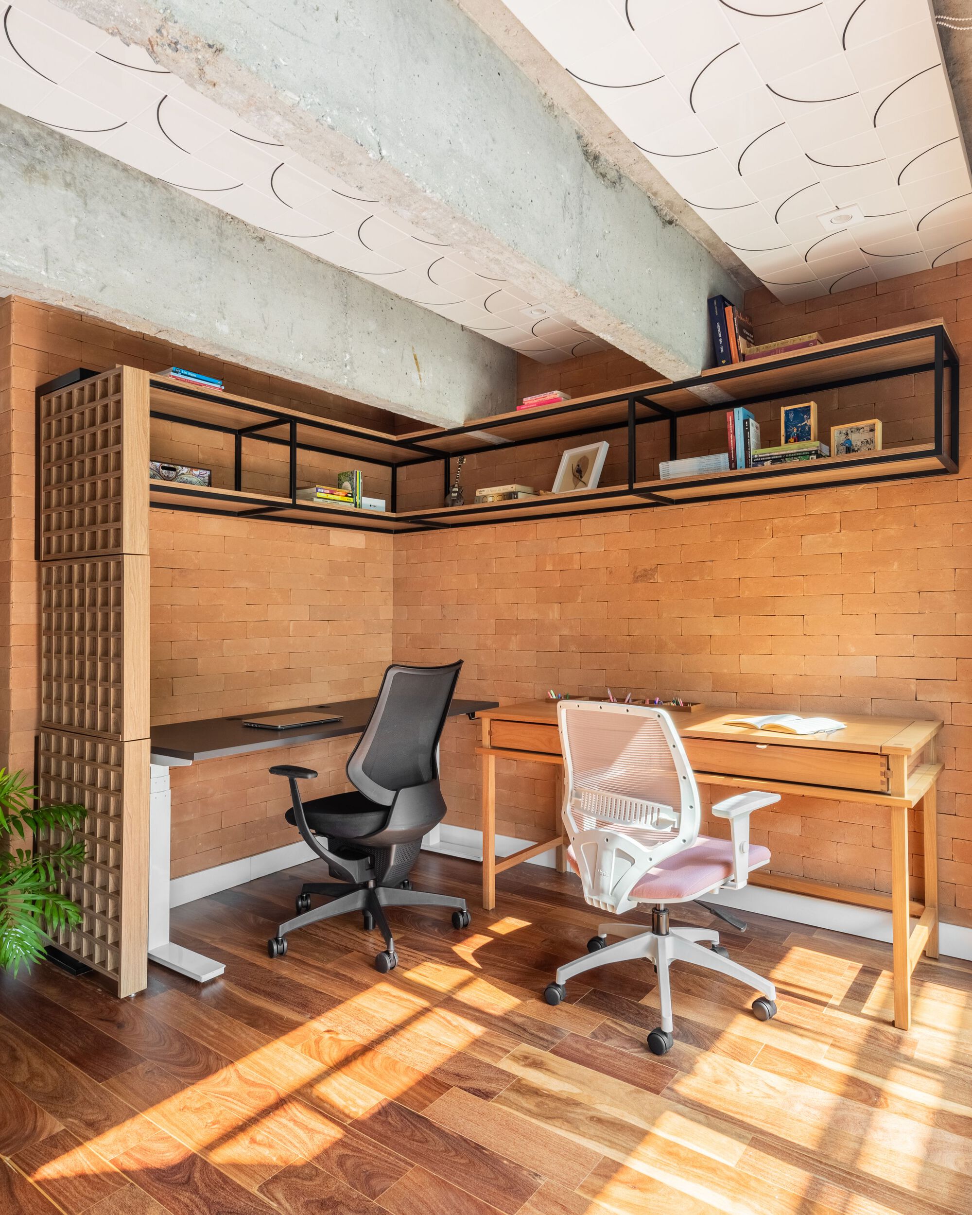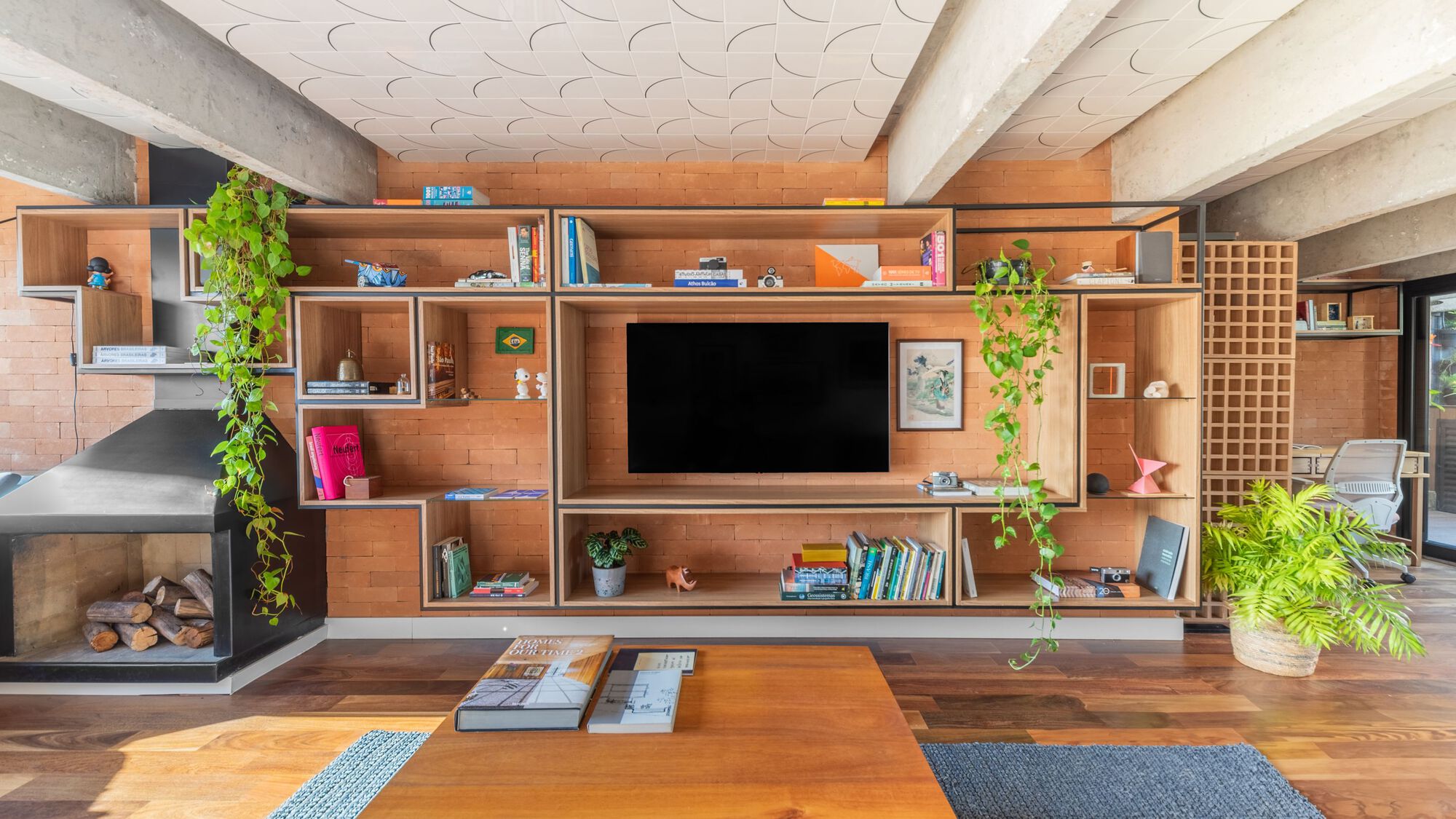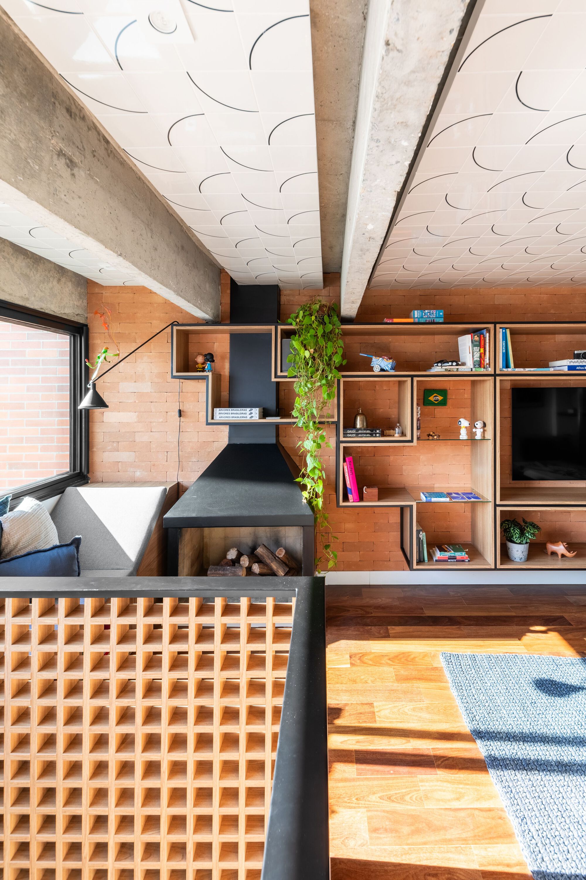 This multifunctional and integrated environment houses the fireplace, TV room, workbenches and games table, which is covered with Portobello tiles from the Athos Bulcão line, which was also used in the ceiling between the exposed concrete beams (originals) of this floor about Brasília, the resident's hometown.