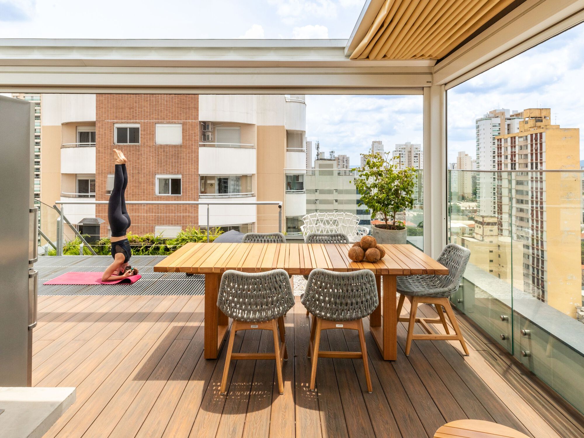 In the outdoor area, the protagonist is the glass-edge swimming pool, which was conceived with reference to a lake surrounded by a forest, so the landscaping was very elaborate in this area, with vertical garden walls that bring a sense of refuge to this rooftop in the middle of São Paulo.