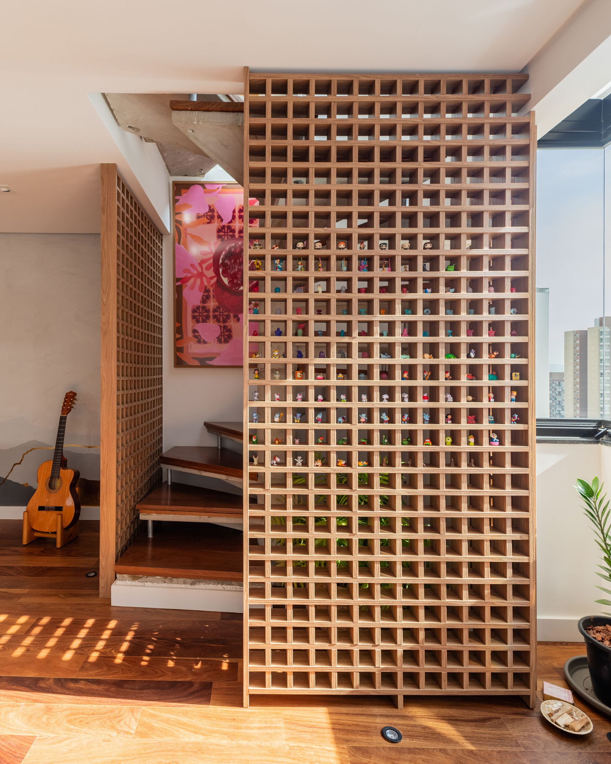 Another highlight of this room is the bookcase nicknamed “Tetris”, which, as the name implies, refers to the pieces of this famous game from the 90s.