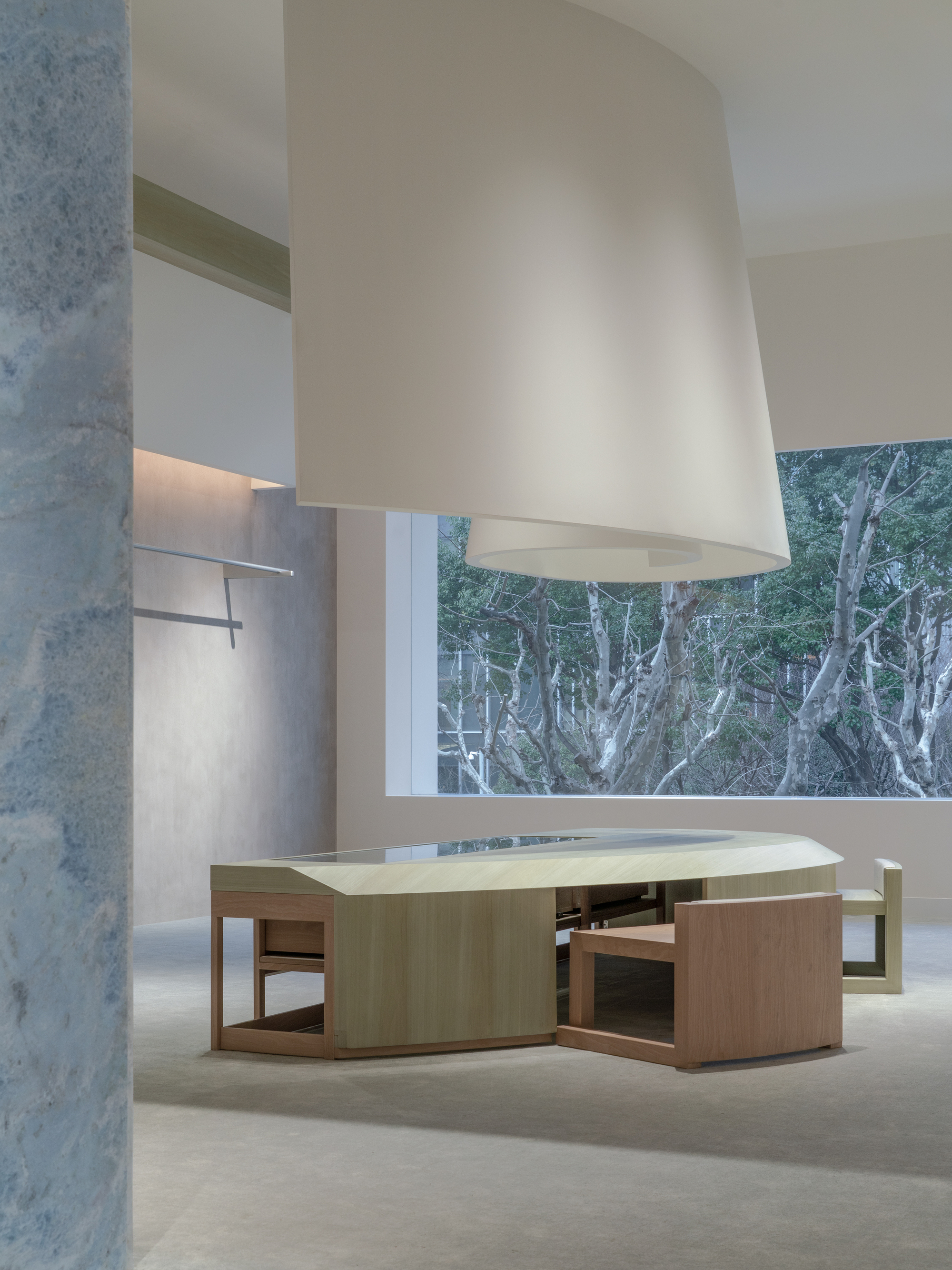 The clothing display area strengthens the sense of boundary through an unusual method of division. The extra-long base plate supports the hanging rods, maintaining the space's beauty whether in use or vacant. So Studio explores the diversity and harmony of materials in its design.