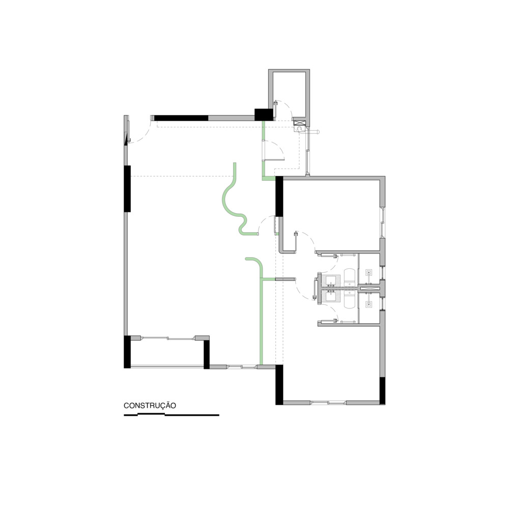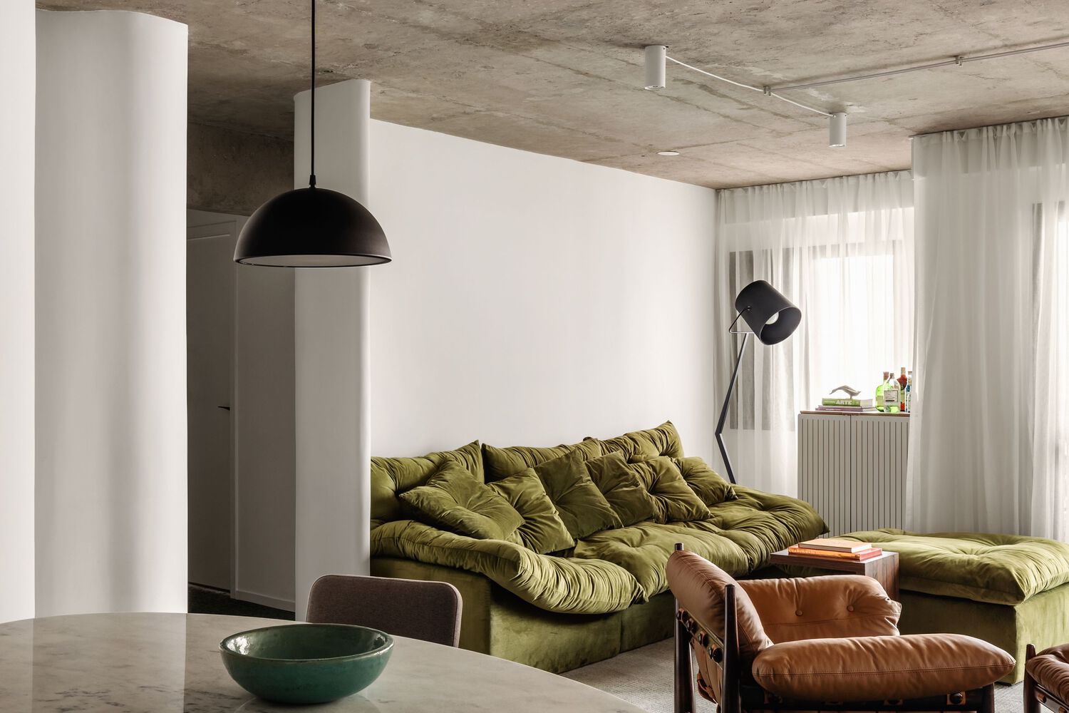 the truth of the materials, highlighting all the structural elements of the apartment; the tiles, inspired by Lina Bo Bardi's Glass House; and, finally, the curves, which became architectural sculptures and sectored the social and intimate areas.