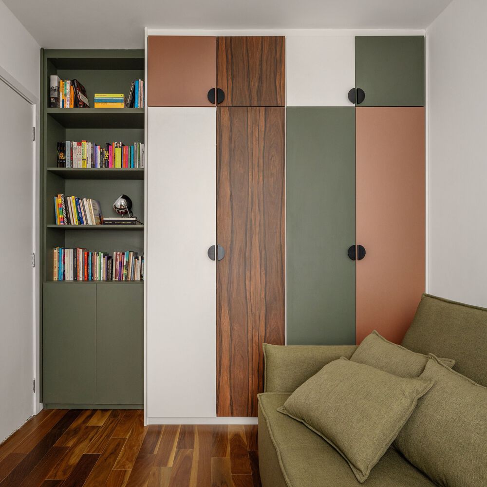 The secondary bedroom was designed to accommodate a future child, hence the open layout and playful joinery.