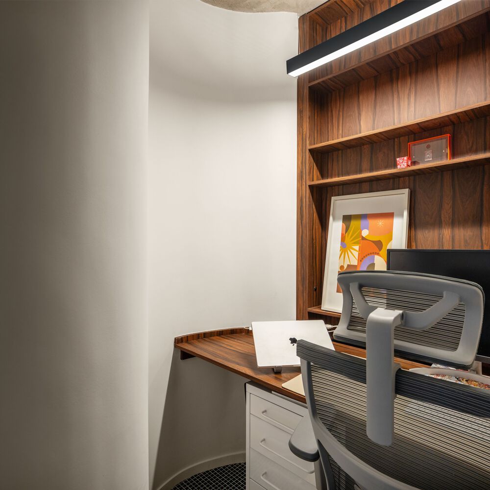 We created a curved division between the social and intimate areas and, next to it, the office, which meets our client's specific needs.