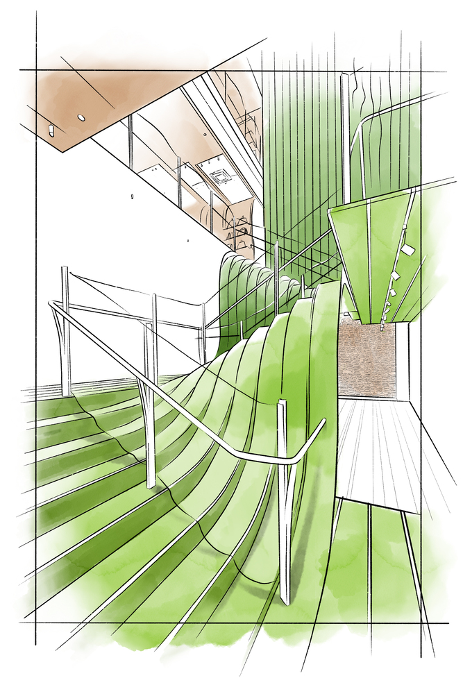 Today, retail is moving away from pure functionality to something more emotional and experiential. The vibrant green staircase evokes movement and momentum, while elements like David Nash's oak sculpture bring a sense of calm and timelessness.