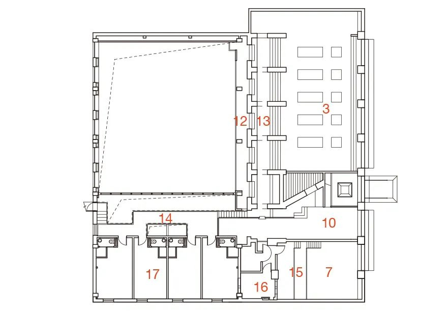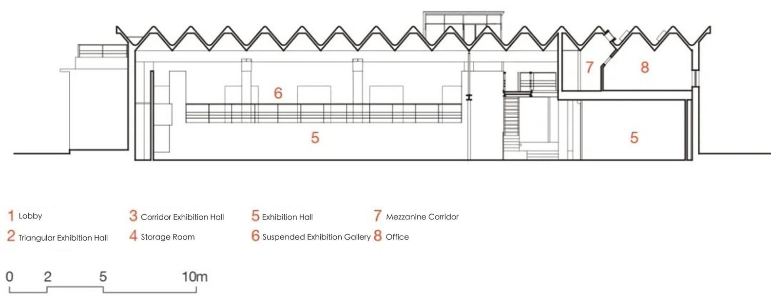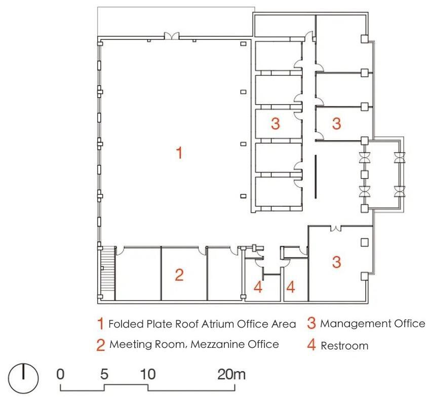 It has concrete columns on the east and west sides supporting a folded concrete roof, creating a column - free space. Before renovation, the southern side had a mezzanine level, while the rest was open - plan office space.