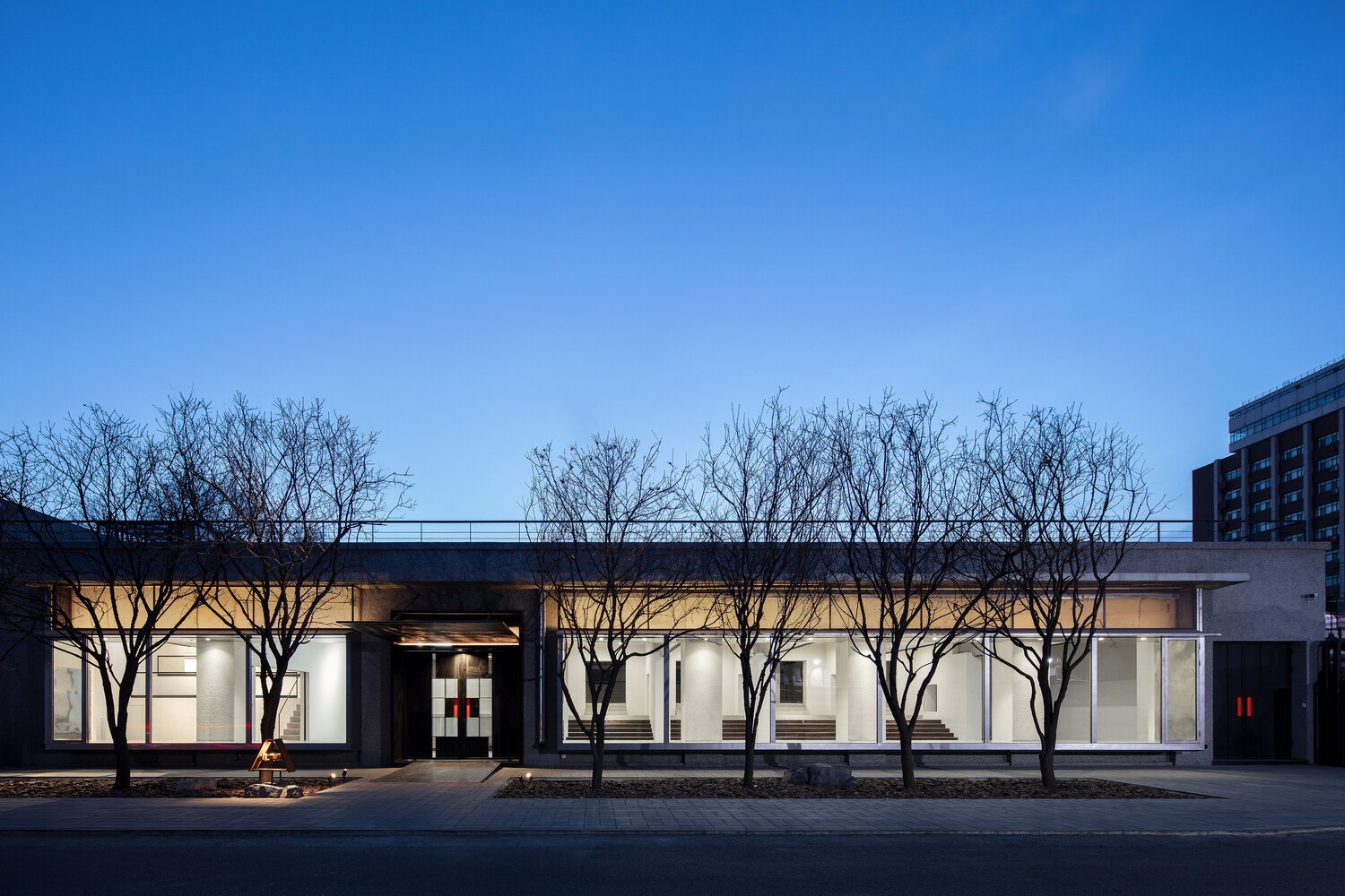 To the east of the entrance, a Chinese pistache tree complements the warm interior lighting. The mezzanine's steel structure extension was detached from the main building.
