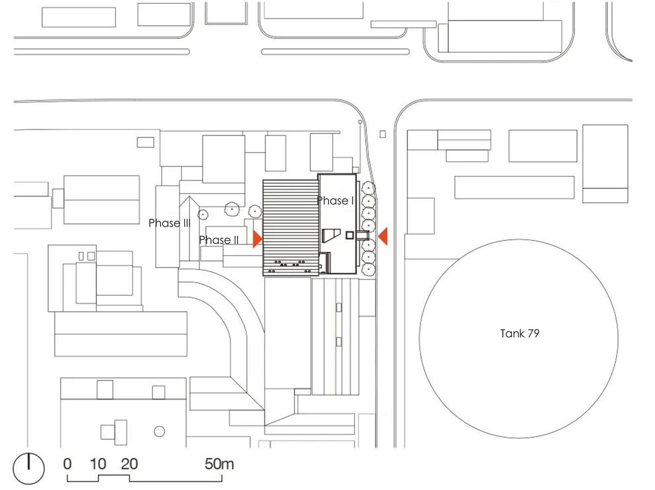Phase I is the main exhibition hall and an art shop. Its original building was an industrial factory from the 1980s with an office extension added in the 1990s.