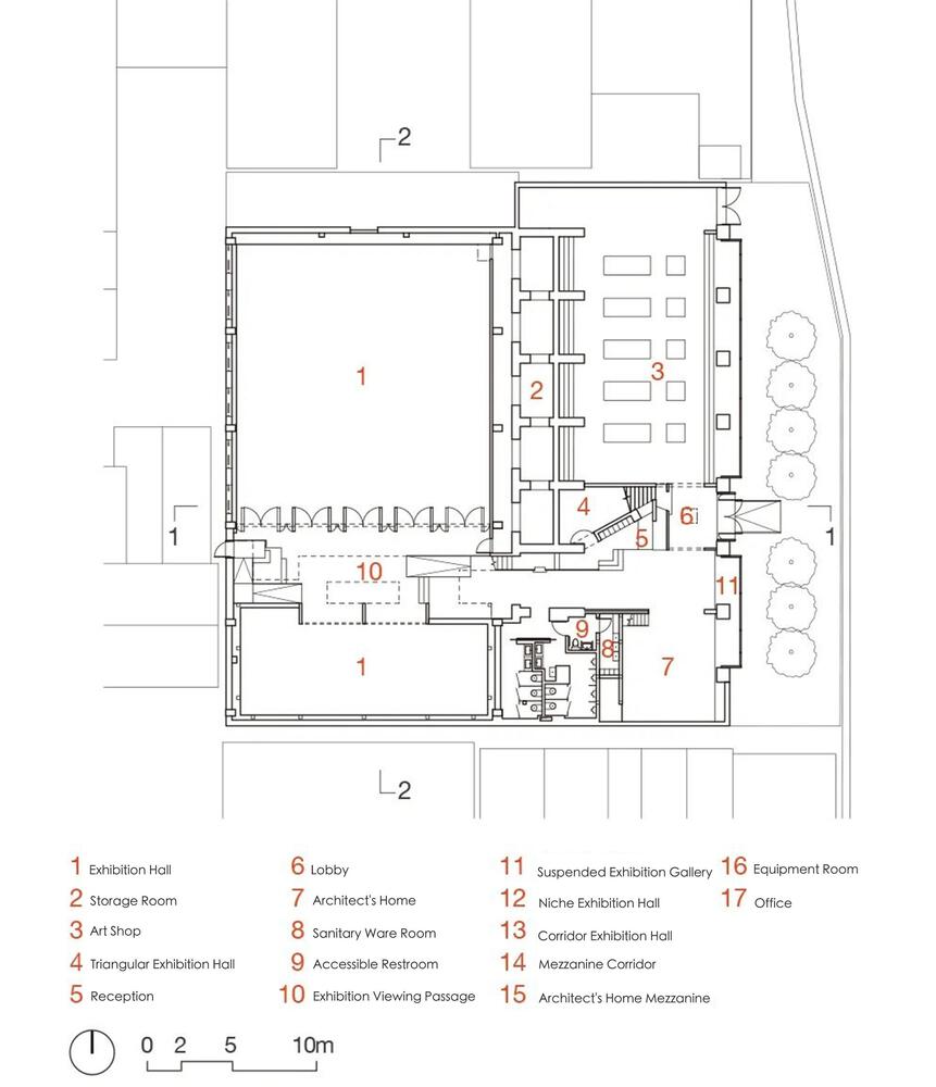 The Architect's Home is in the southeast corner, with a steel staircase leading to the mezzanine.