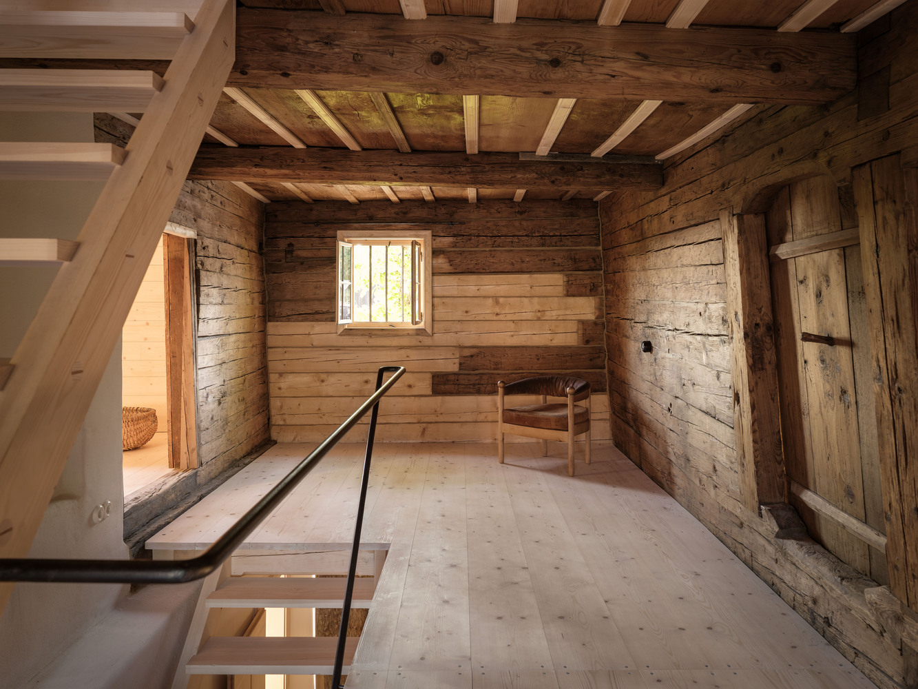 The key design move consisted of inserting several precisely fitted room-sized volumes into the existing log structure.
