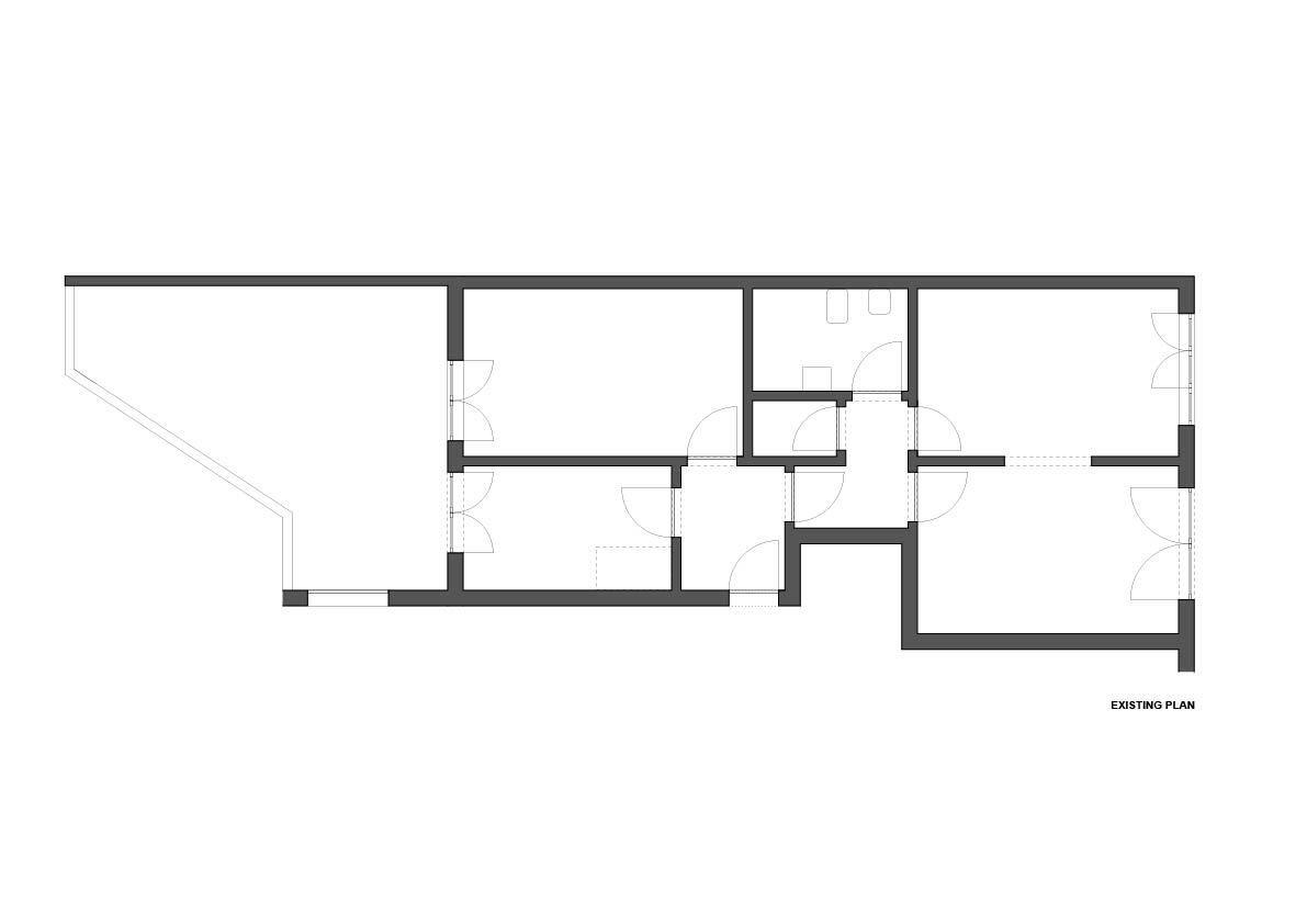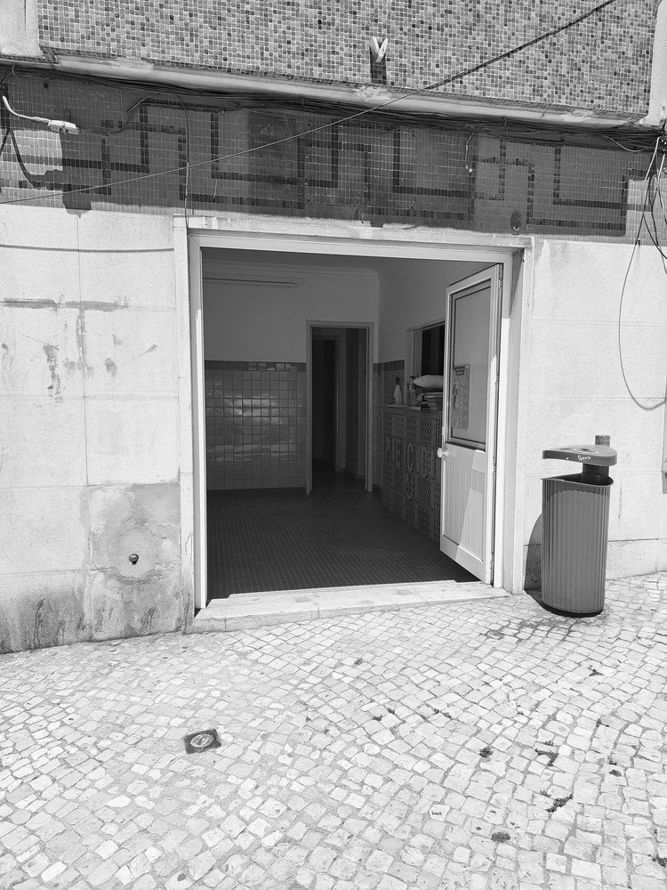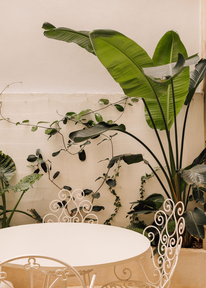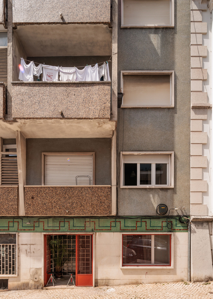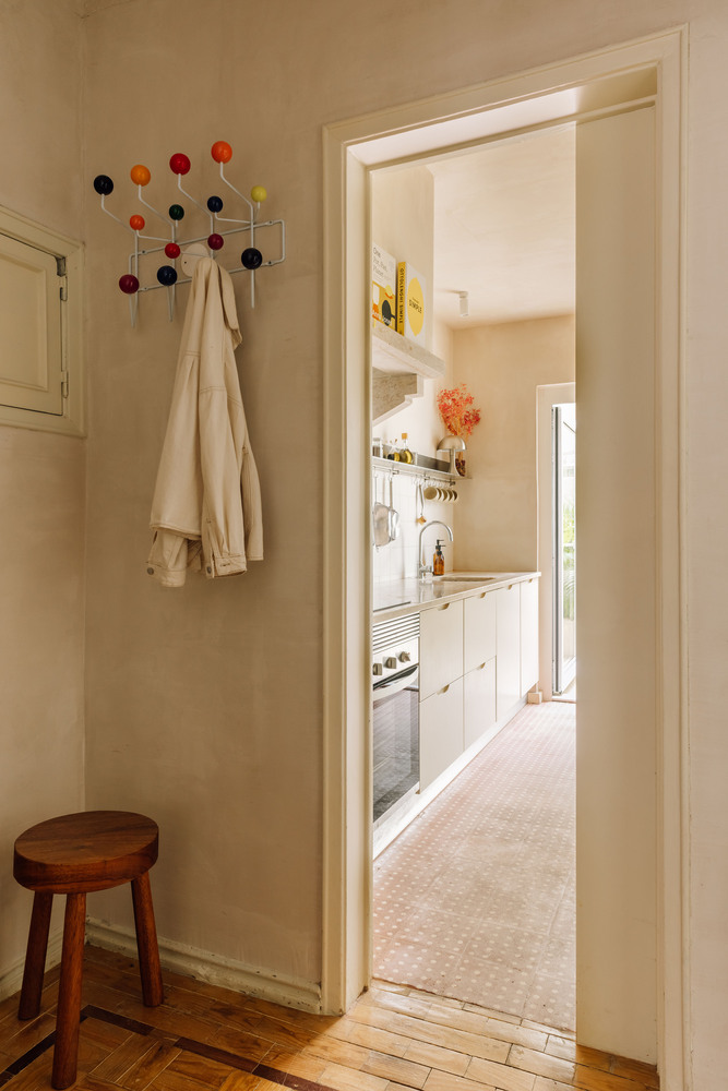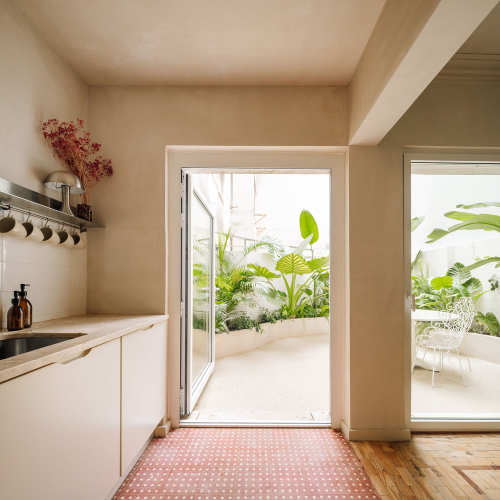 An abandoned commercial space in a lively Lisbon neighborhood, Campo de Ourique, was transformed into a compact flat with a small backyard.