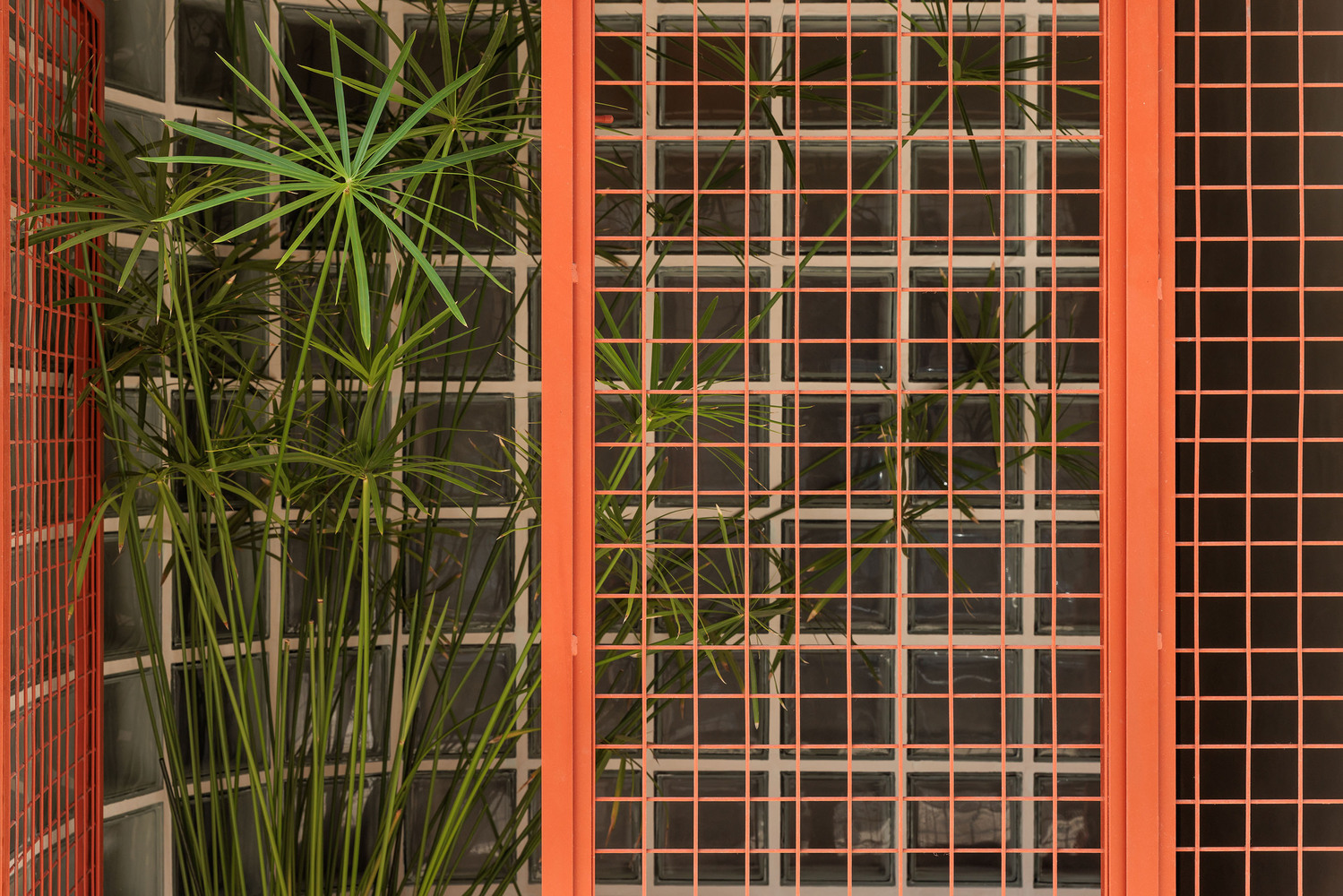A red metal grid was added to the existing storefront, creating a protective yet porous threshold that mediates between the street and the interior.