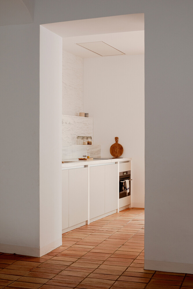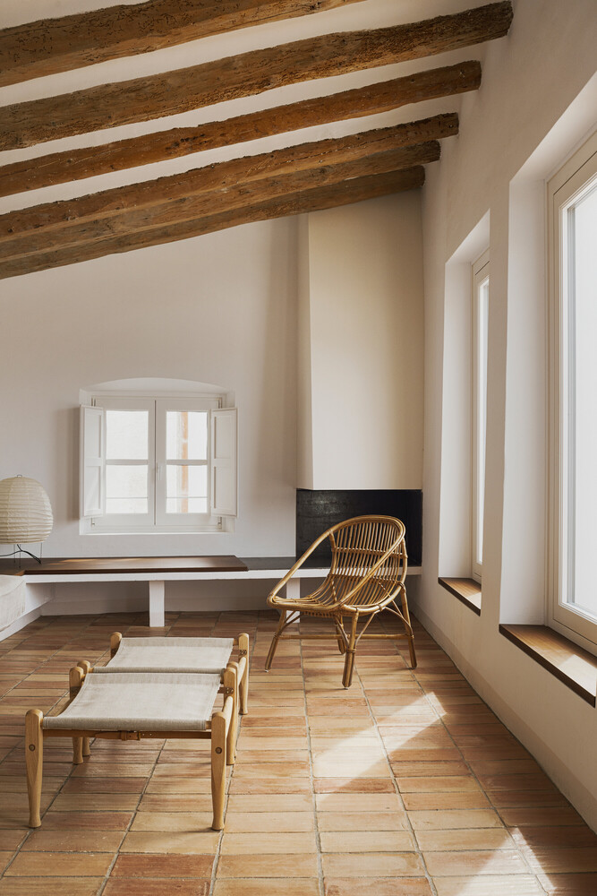 Original ceramic tiles have been restored, evoking the memory of the place, while the walls plastered with white lime reinforce the Mediterranean atmosphere and promote breathability, a fundamental quality in humid climates like that of the Ampurdán coast.