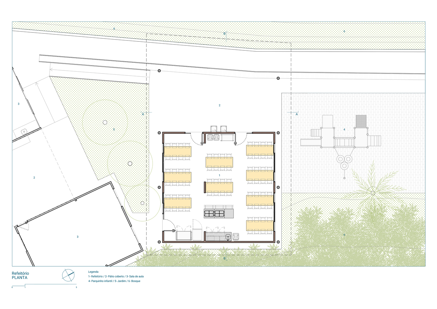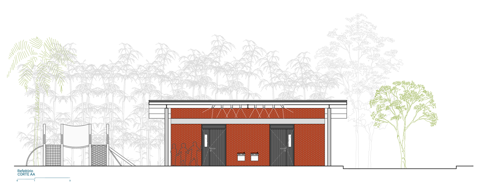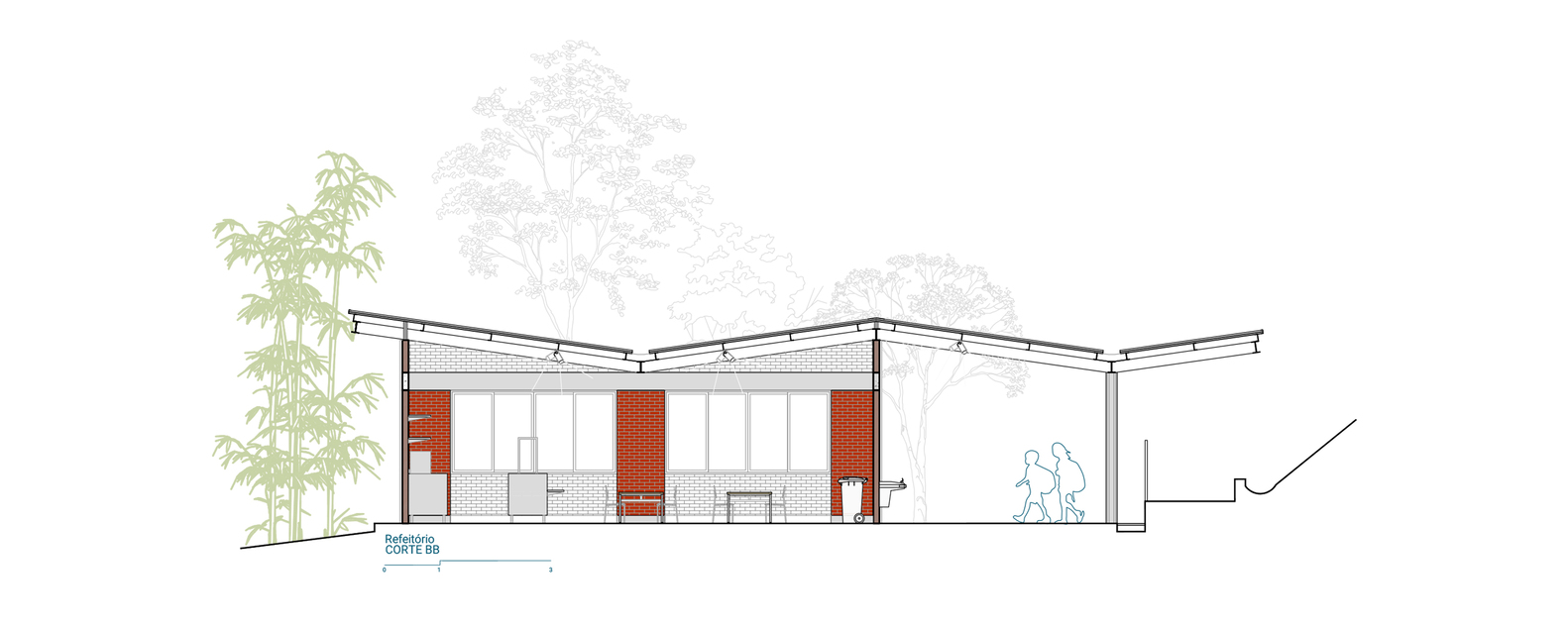 A roof composed of concrete pillars, metal beams, and thermal-acoustic tiles was proposed to cover the structure and create a sheltered space for students, enlarge the cafeteria, and renew the entrance of the complex.
