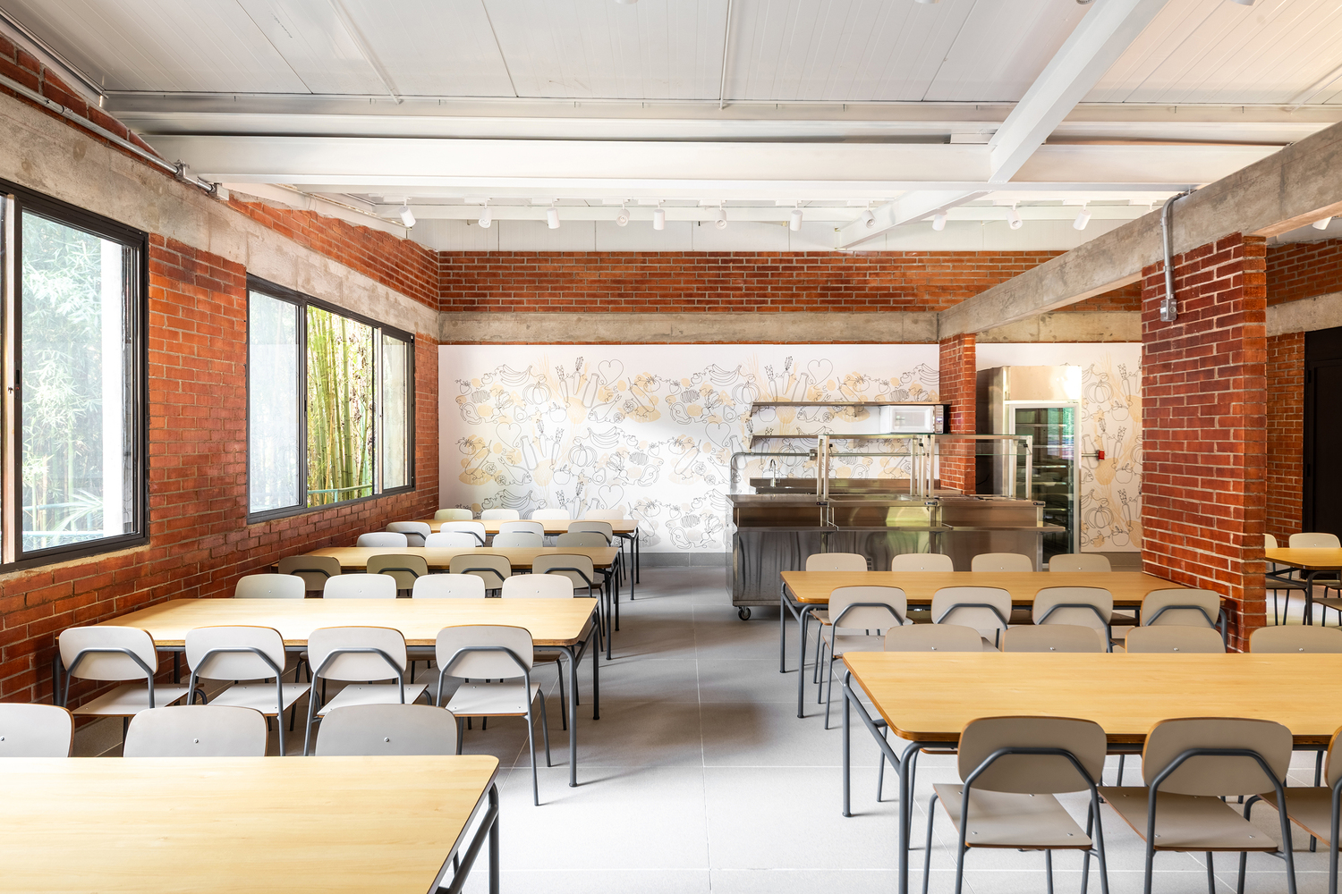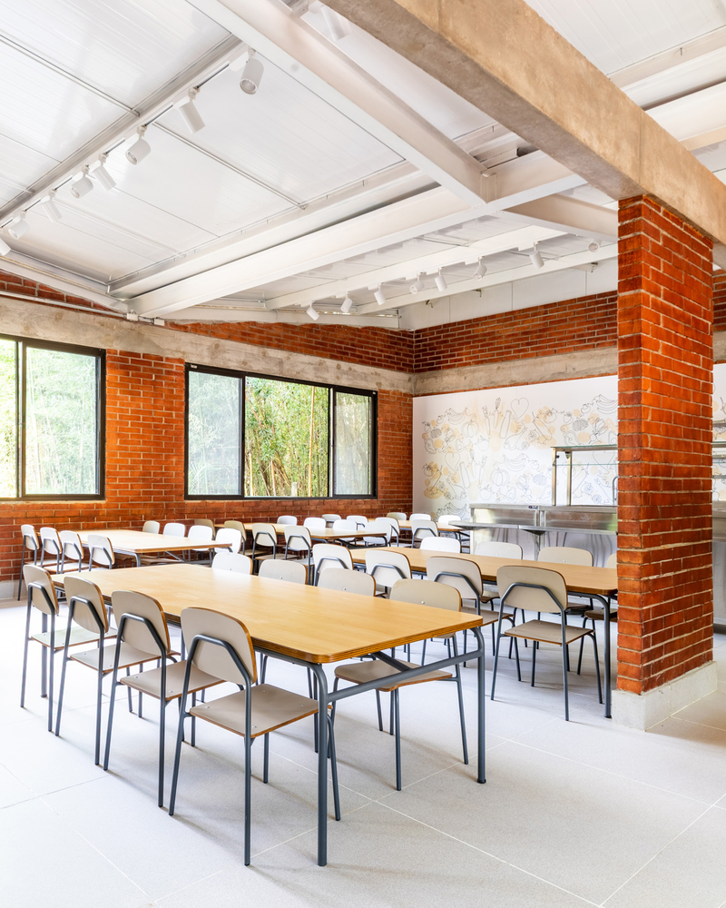 The space was designed with three access points: two organize the flow of student entry and exit, and a side technical entrance for food supplies and cleaning without compromising access for students and educators.