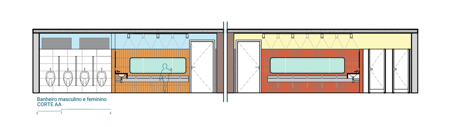 In the outer section, the group can expand, and students can cook collectively. In the restrooms, color signals the sinks and guides students in using the facilities.