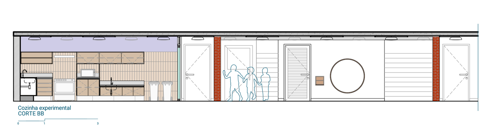 The Experimental Kitchen is divided into two parts. In the inner section, where there are fixed counters at two heights and equipment, use is mediated by educators.