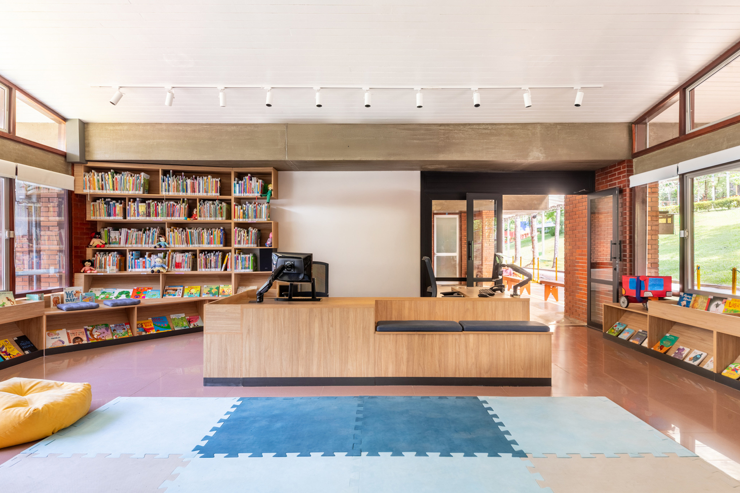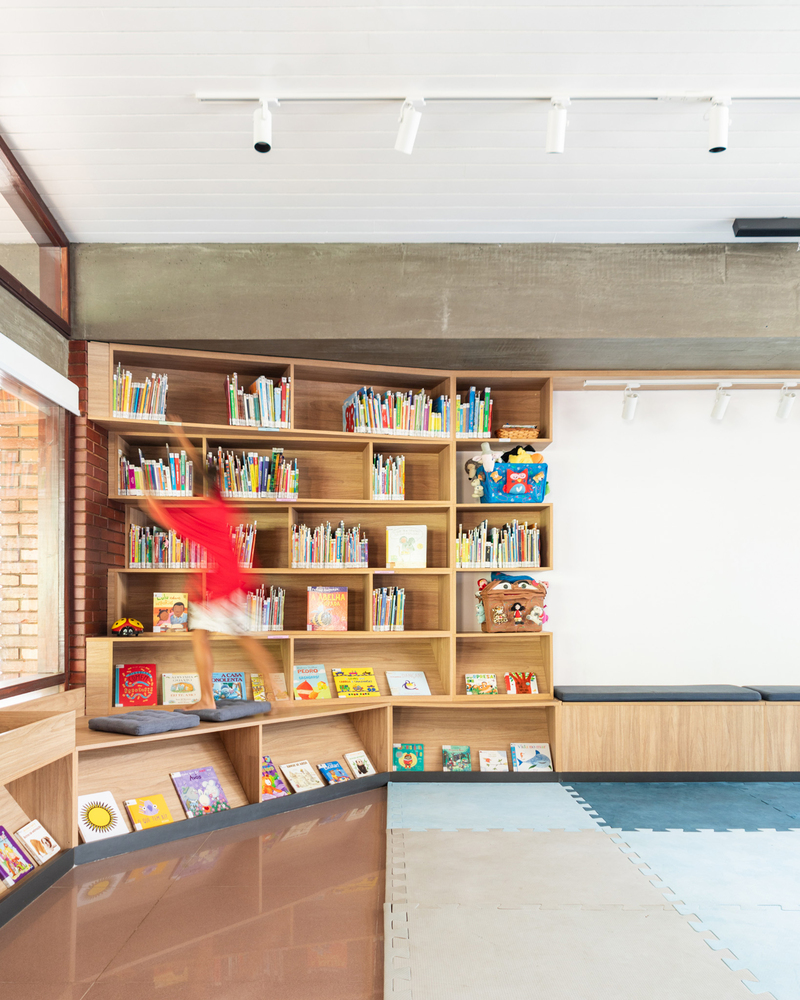 On the side walls, shelves were designed to display books in various ways, blending reading areas with spaces to sit, lie down, or climb.