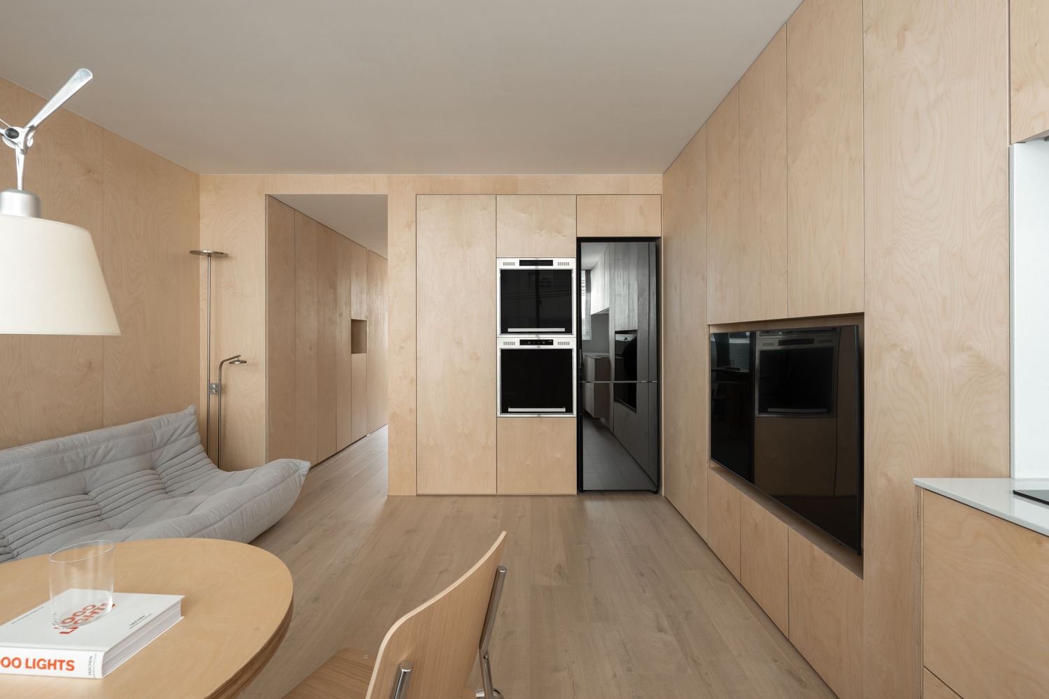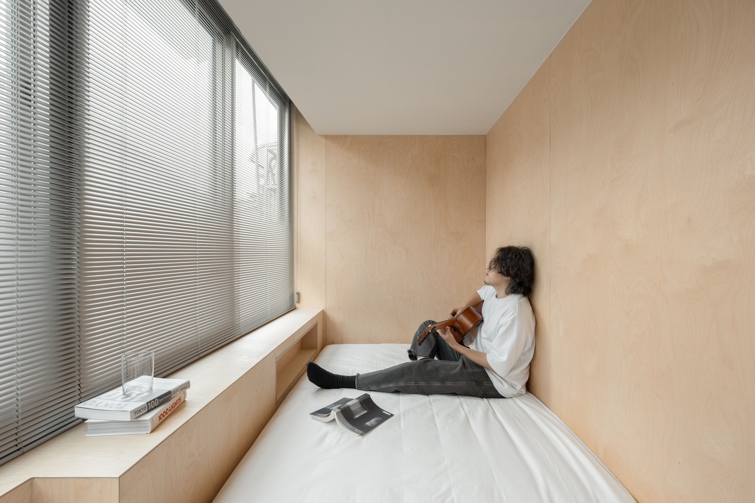 The door to the bedroom adopts a concealed pivot design that hides within the wall when open, softening spatial boundaries and creating a coexistence between separation and continuity.