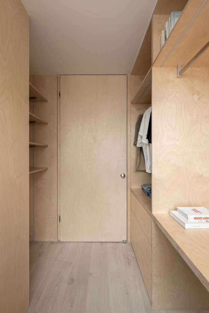In the residential unit, the entryway integrates wardrobe and laundry functions, allowing users to complete cleaning and changing the moment they return home — reflecting a post-pandemic awareness of hygiene and personal space.