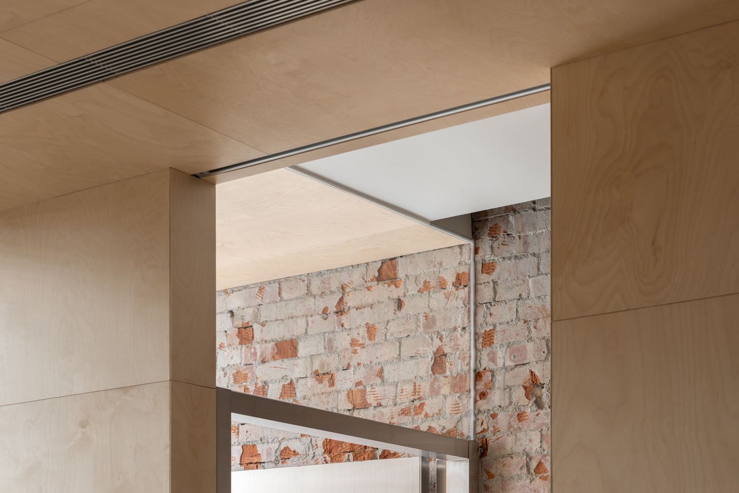 In the ground-floor office, selective demolition reveals the brick structure of the old house.
