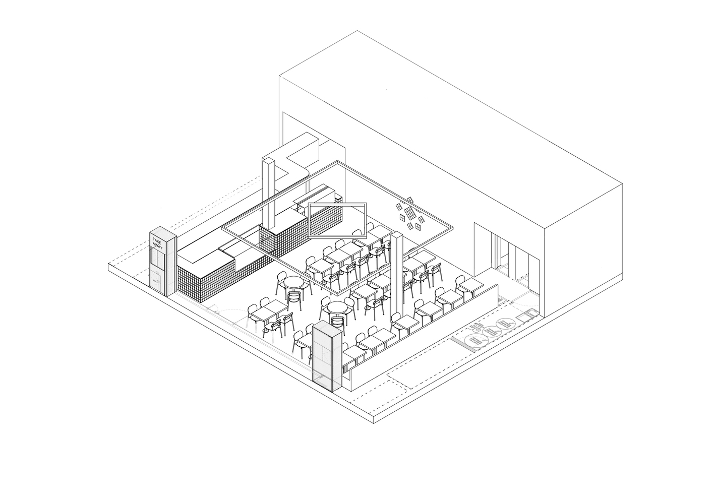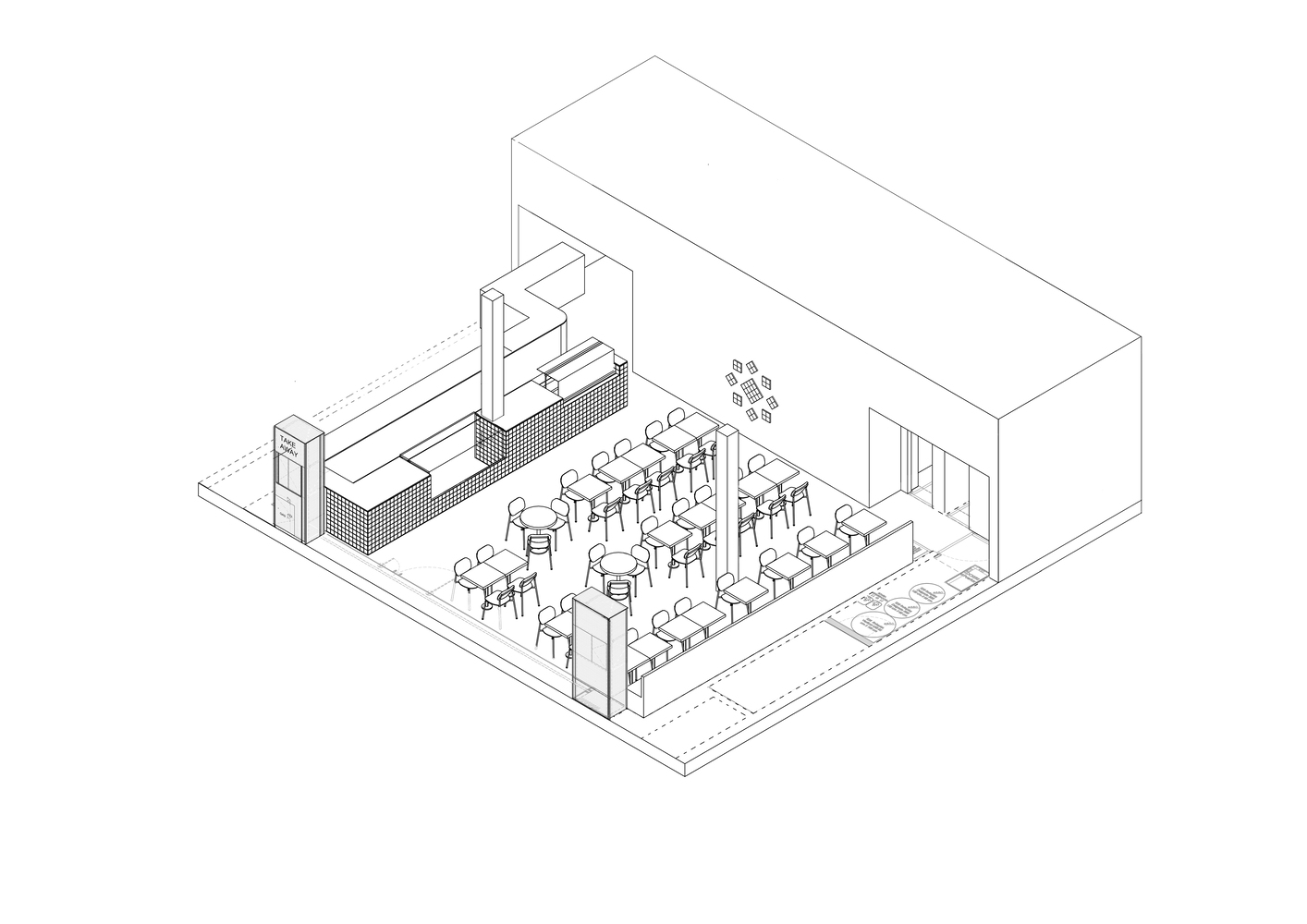 A linear bar runs along one side of the venue and extends to the front façade, facilitating direct interaction with the sidewalk.