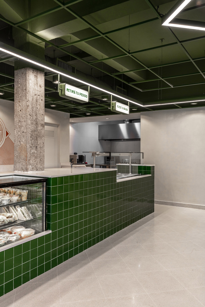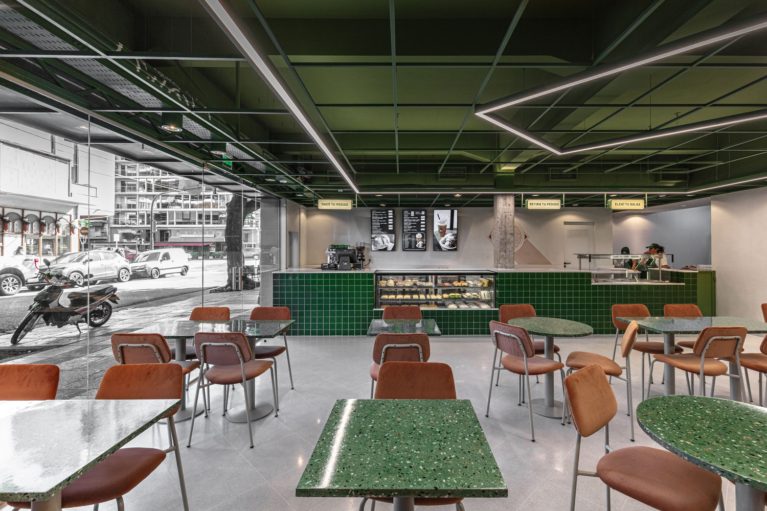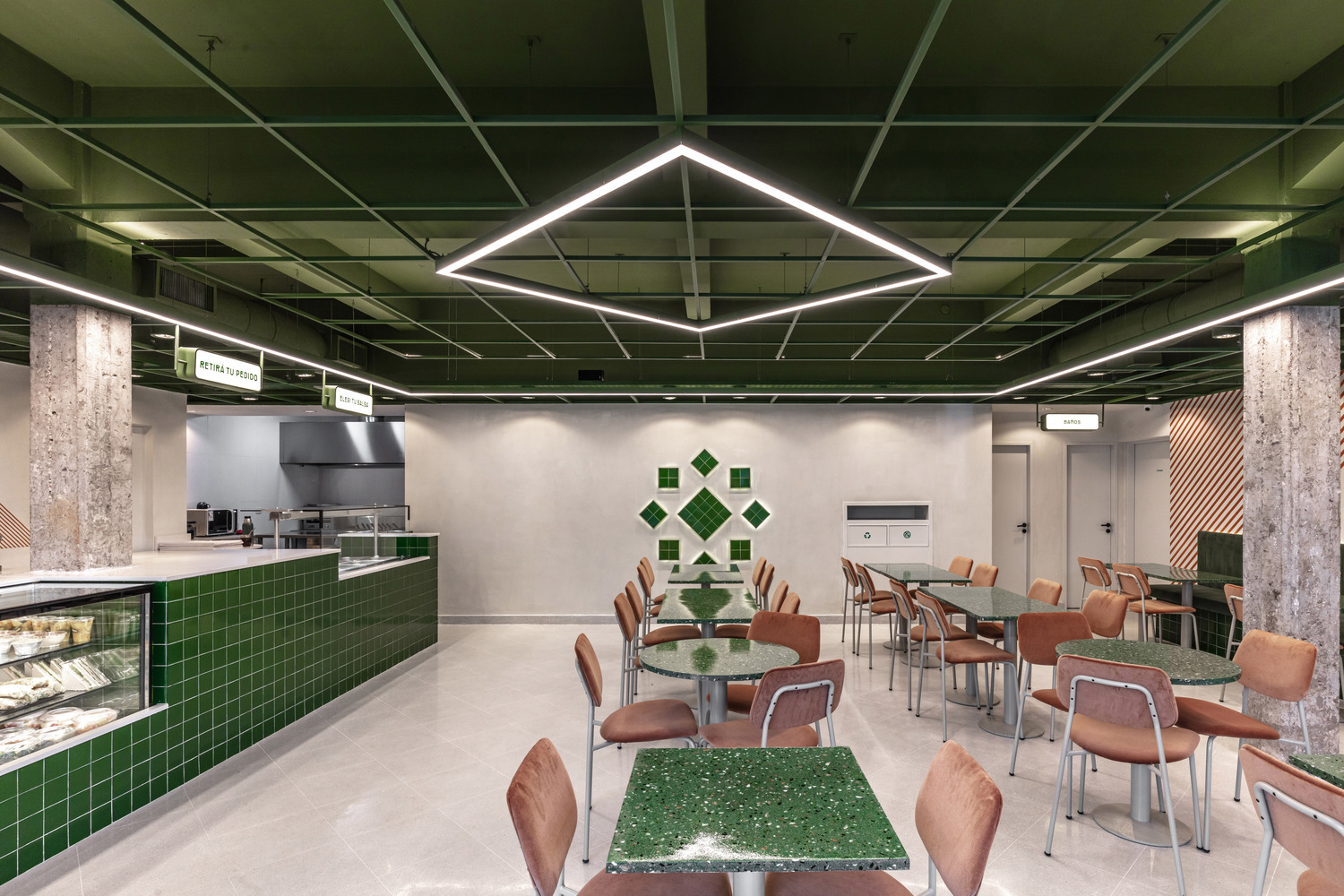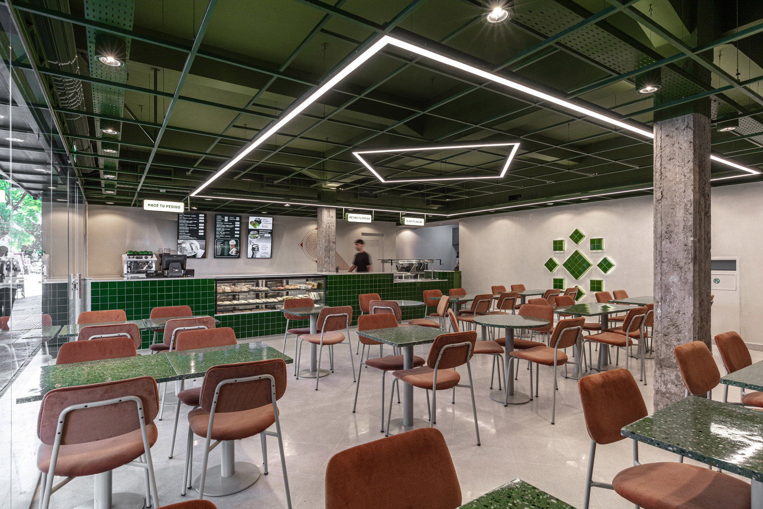 The color green, used in both the metal system and the bar tiles, gives the space a strong brand presence, establishing a coherent and distinctive visual identity.