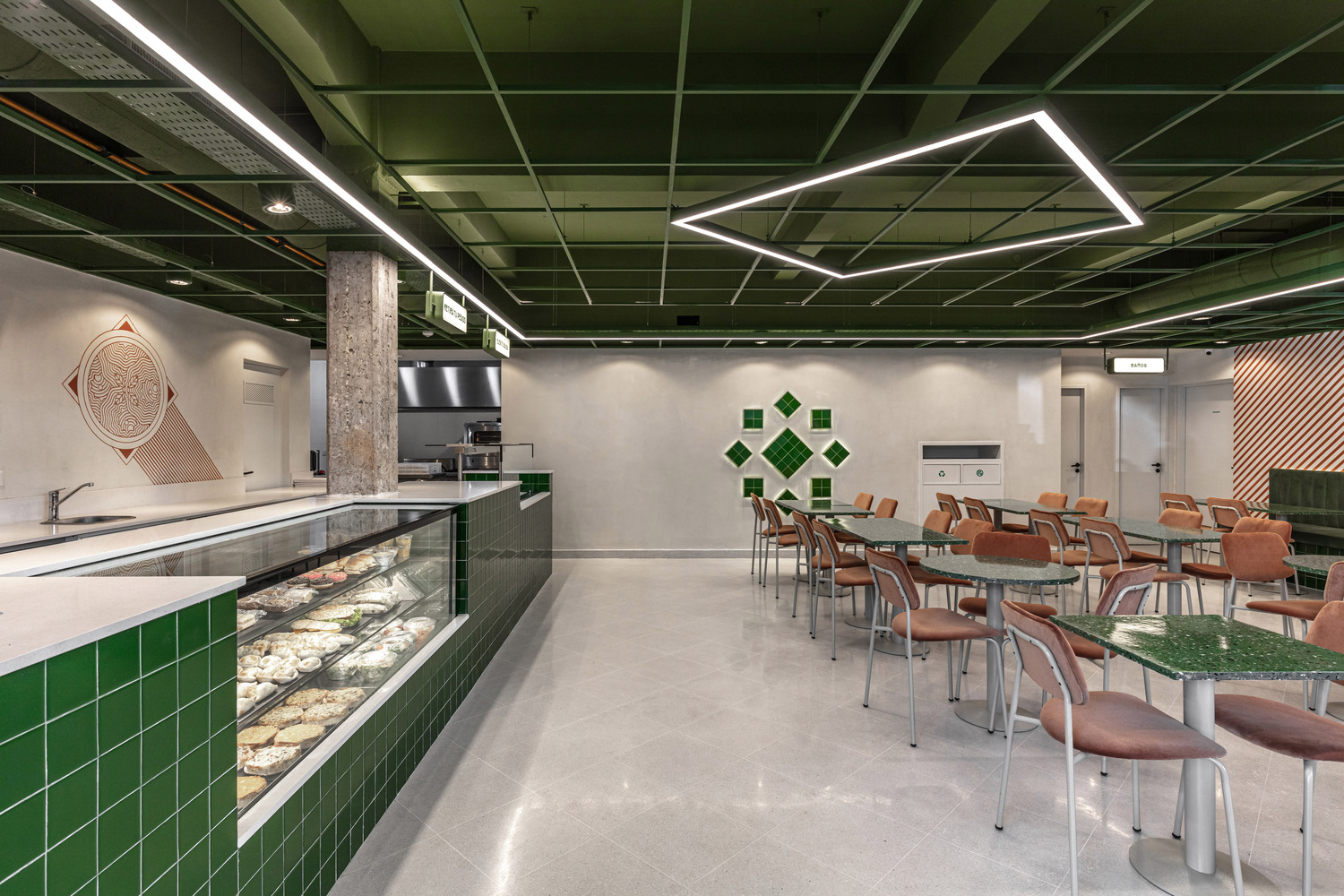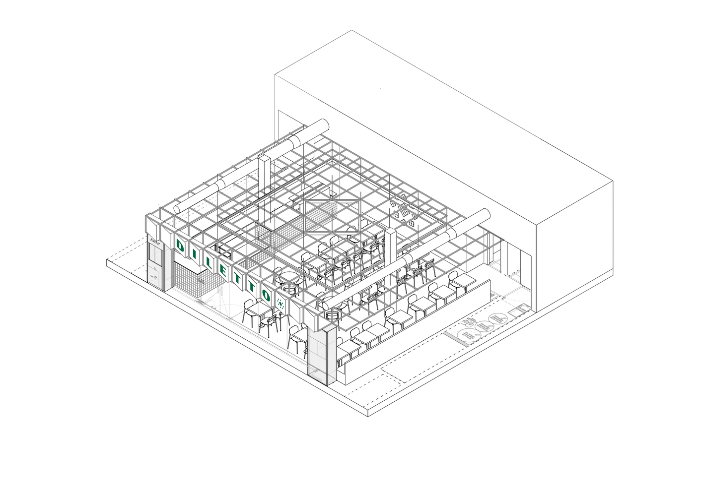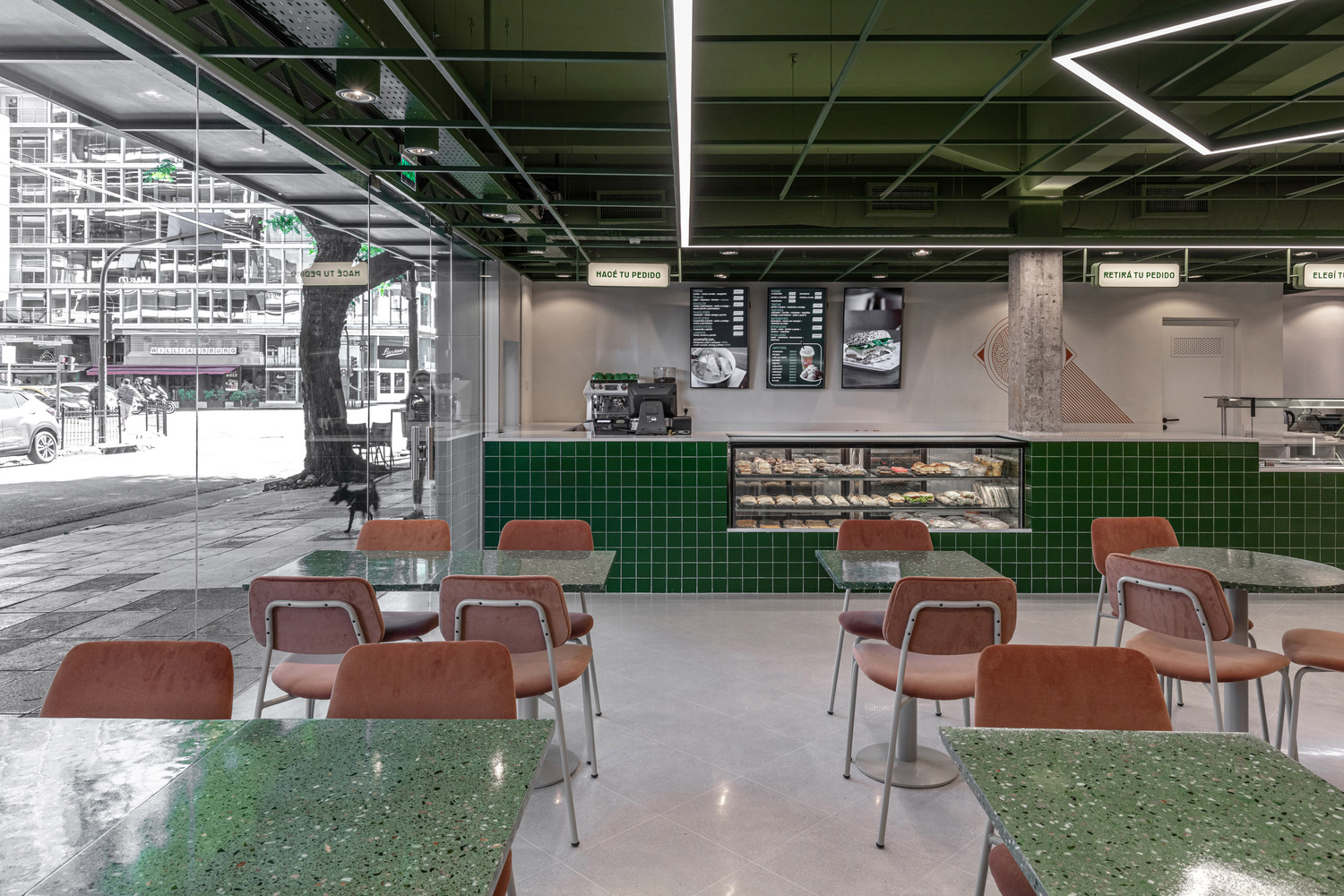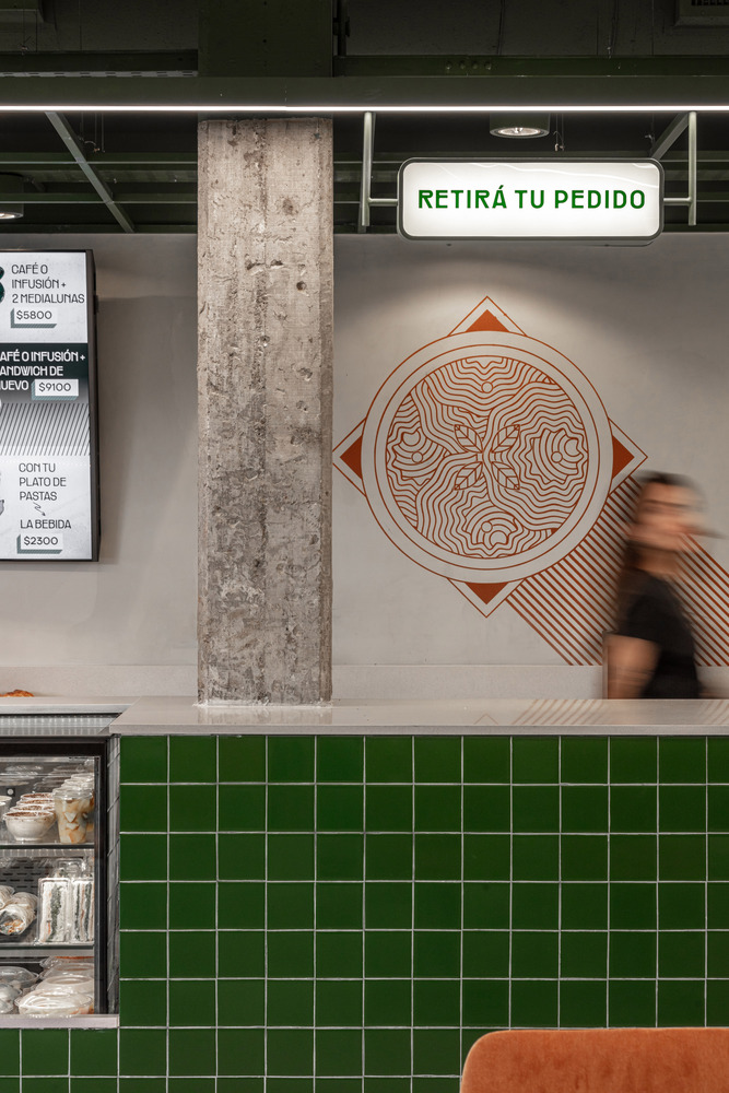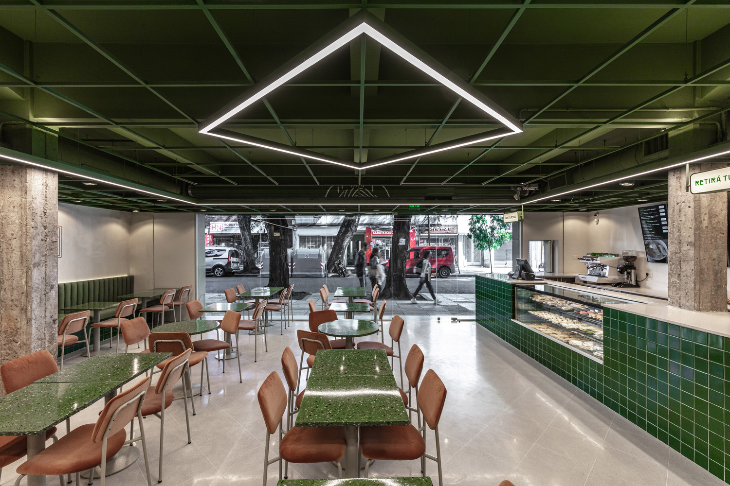 The color green, used in both the metal system and the bar tiles, gives the space a strong brand presence, establishing a coherent and distinctive visual identity.