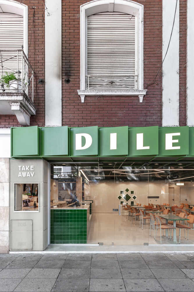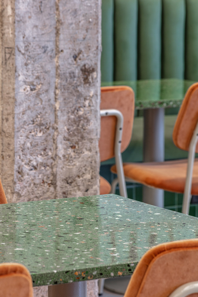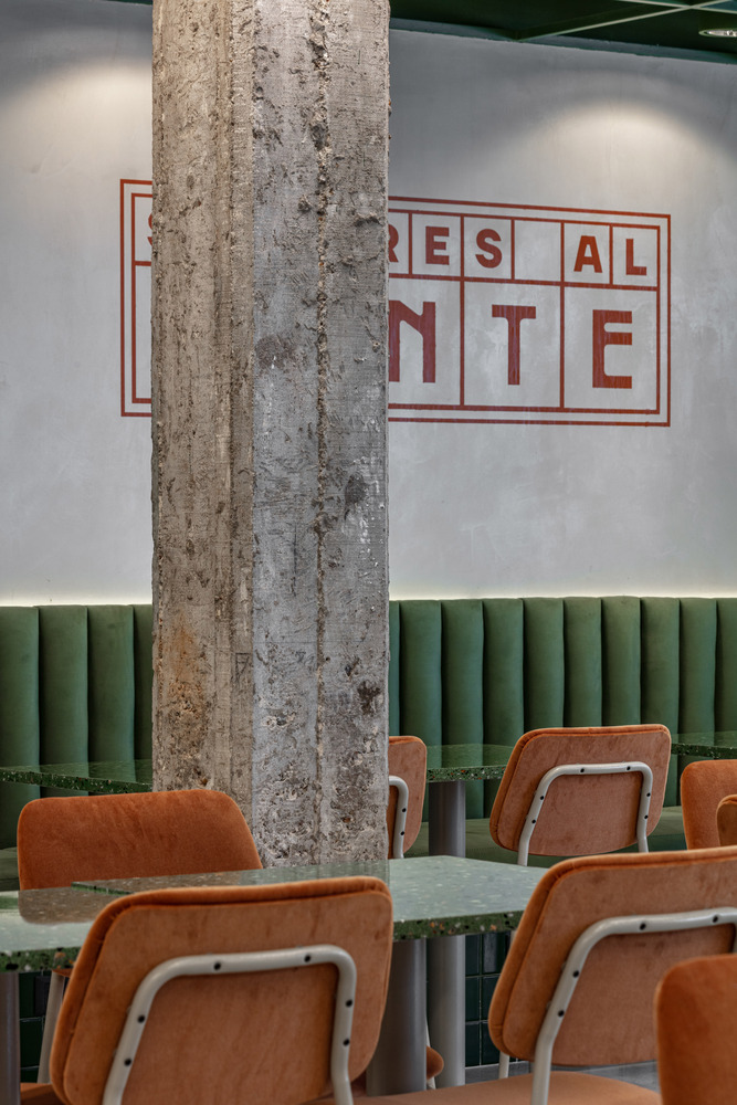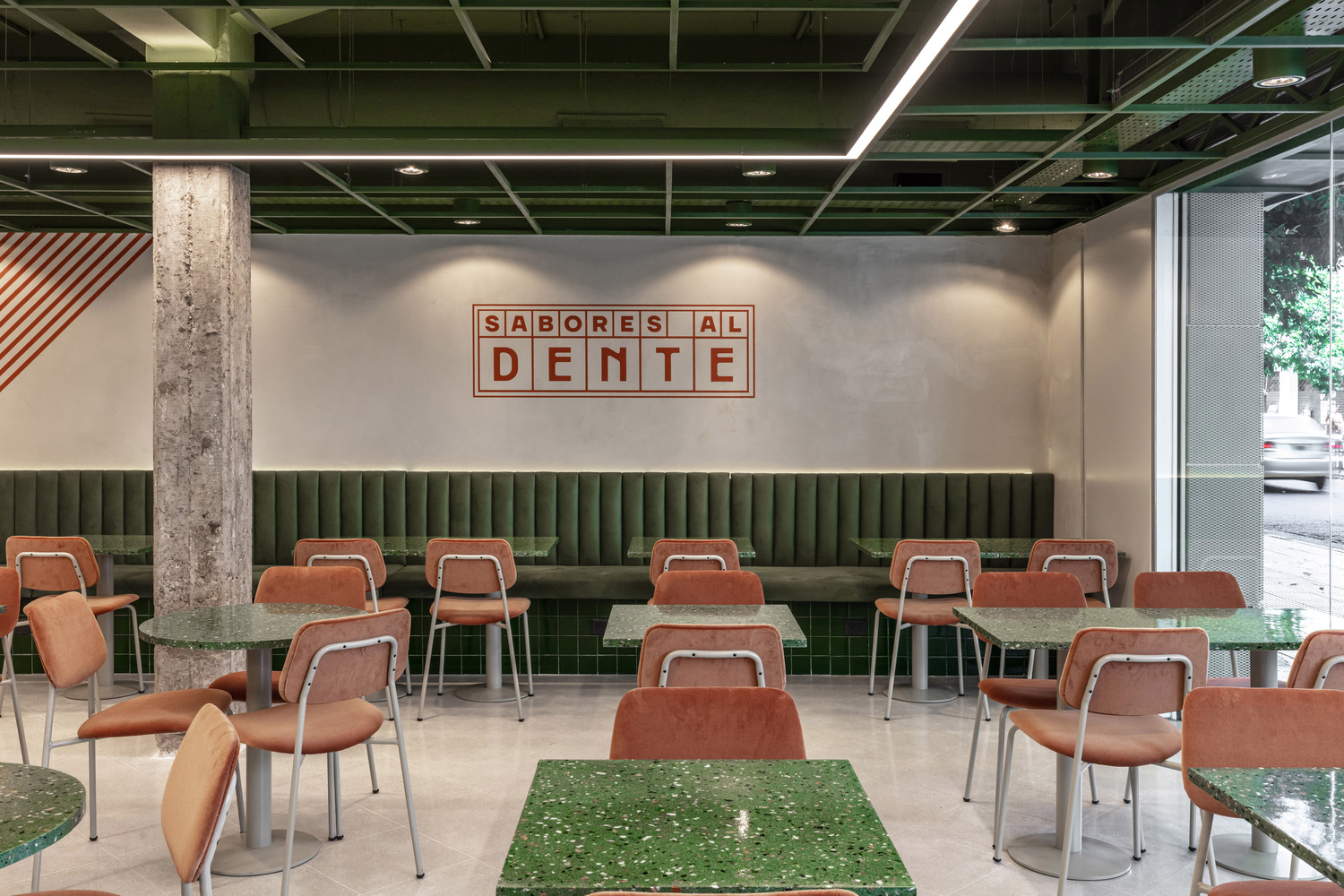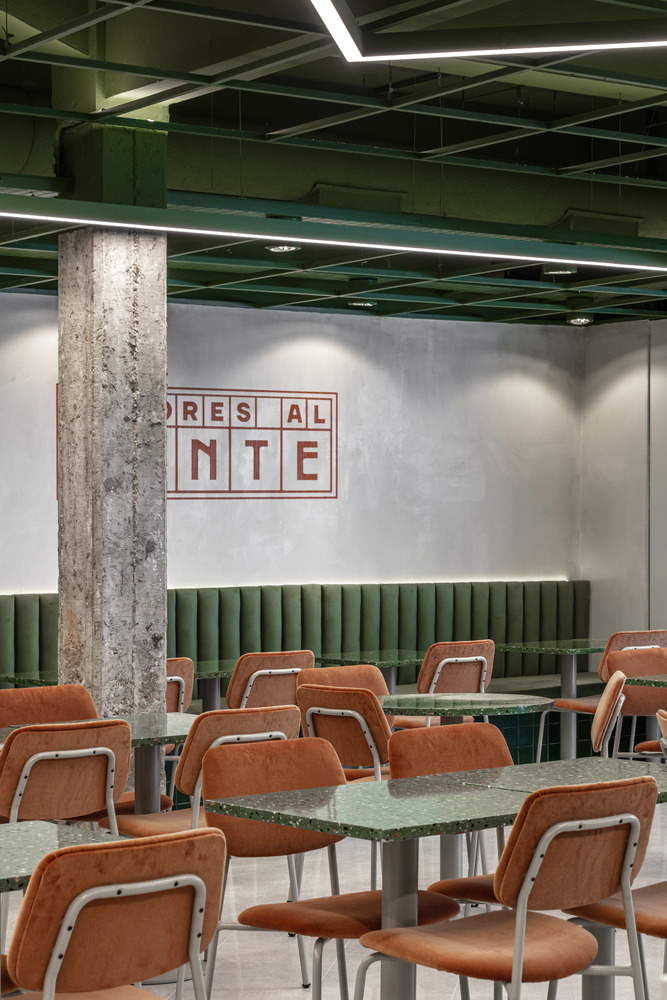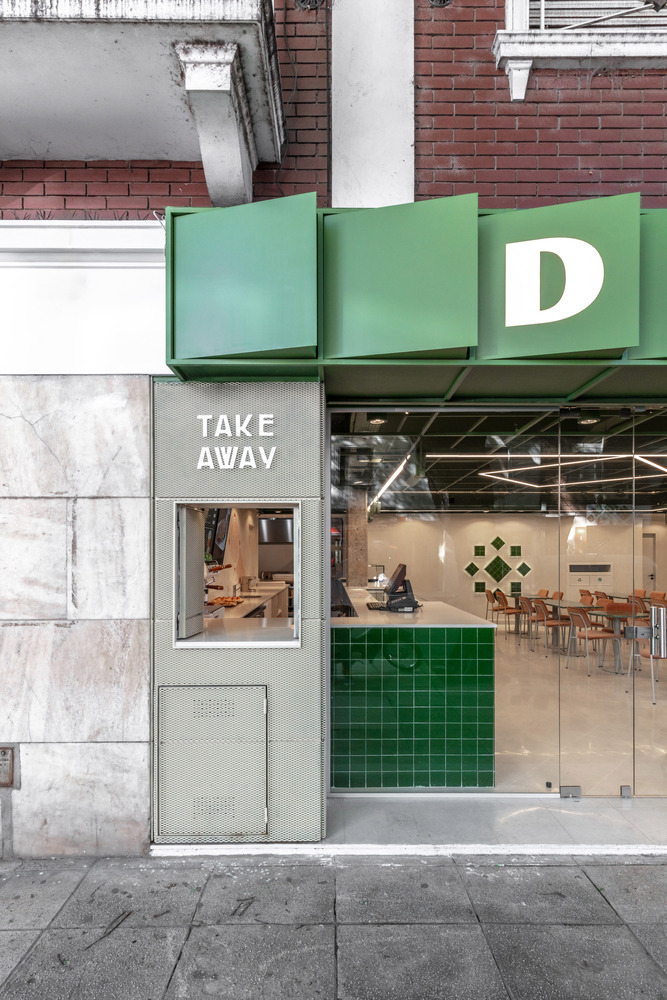 The color green, used in both the metal system and the bar tiles, gives the space a strong brand presence, establishing a coherent and distinctive visual identity.