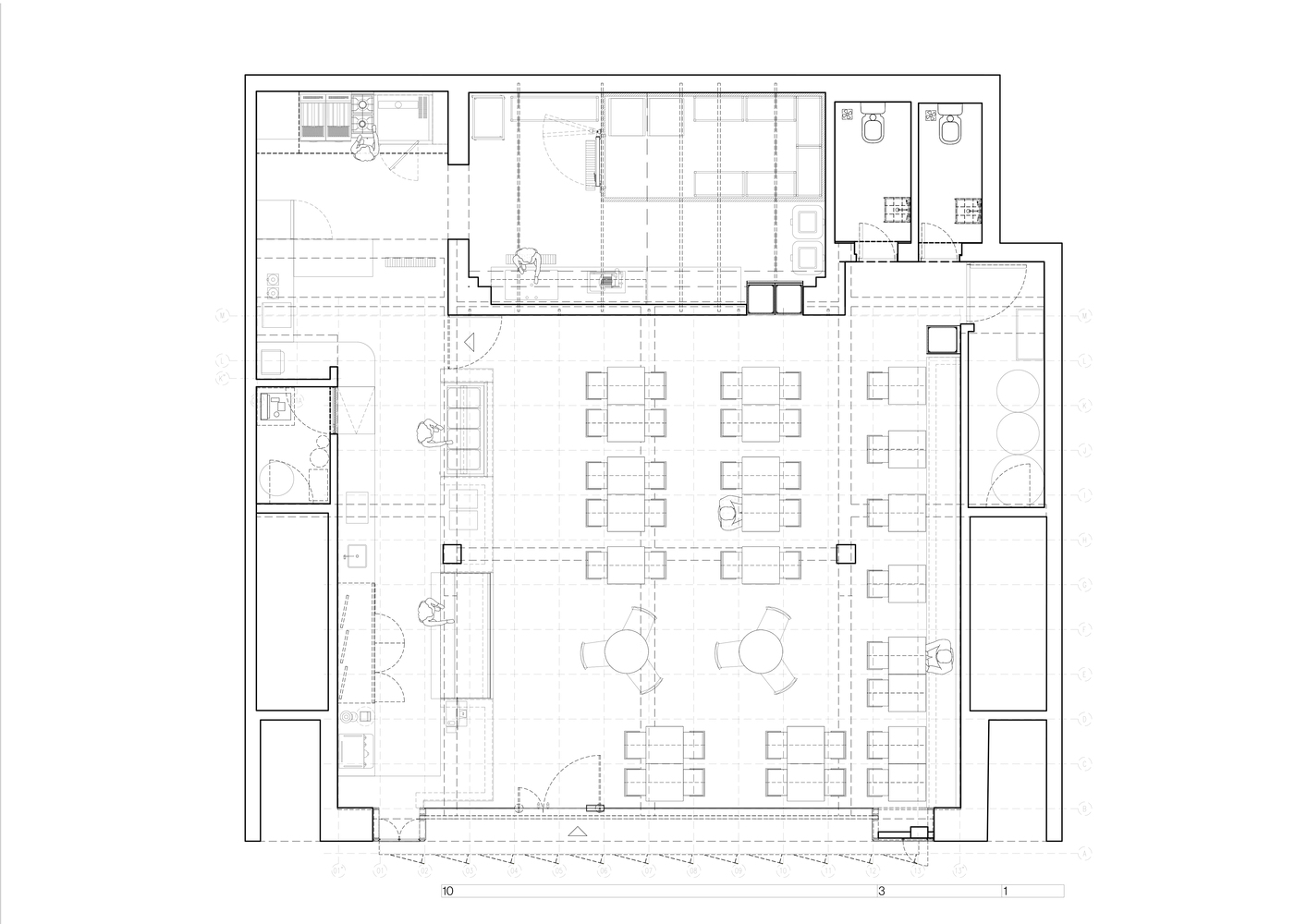 All movable and fixed furniture, including tables and benches, was custom-designed for Diletto, with uniform proportions across all elements to maintain aesthetic consistency and brand recognition.