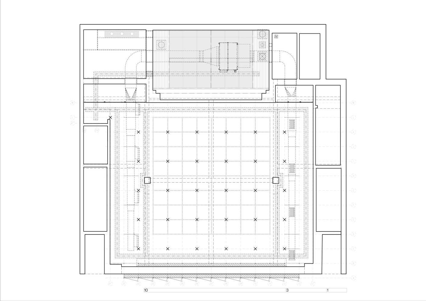 To achieve this, a suspended metal structure was created, covering the entire space with a regular square grid.